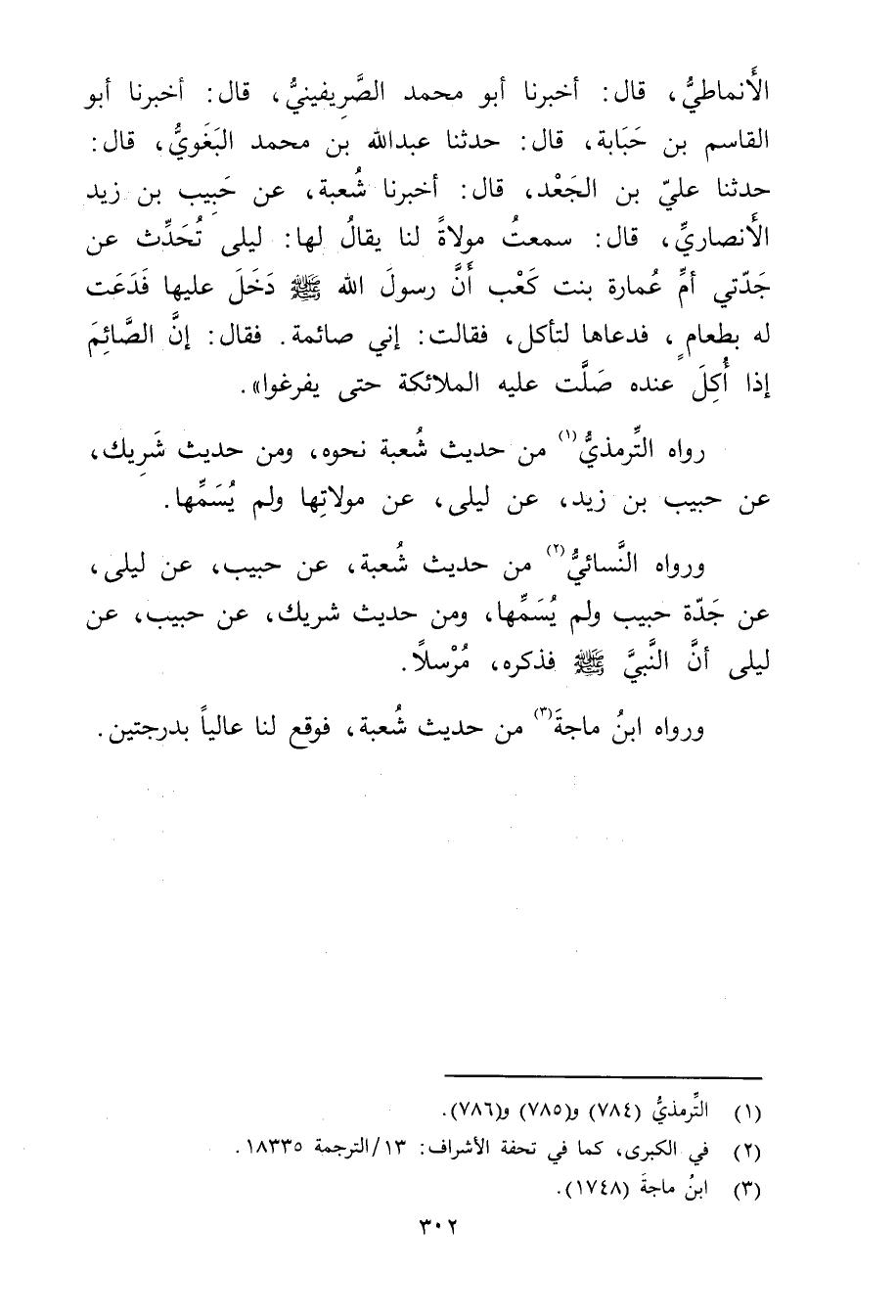 الأَنْصارِيّ، قال: سَمِعْتُ مَوْلاةً لَنَا يُقَالُ لَهَا: لَيْلَى تُحَدِّثُ عَنْ جَدَّتِي أُمِّ عُمَارَةَ بِنْتِ كَعْبٍ أَنَّ رَسُولَ اللَّهِ صَلَّى اللَّهُ عَلَيْهِ وسَلَّمَ دخل عَلَيْهَا فَدَعَتْ لَهُ بِطَعَامٍ، فَدَعَاهَا لِتَأْكُلَ، فَقَالَتْ: إِنِّي صَائِمَةٌ. فَقَالَ: إِنَّ الصَّائِمَ إِذَا أَكَلَ عِنْدَهُ صَلَّتْ عَلَيْهِ الْمَلائِكَةُ حَتَّى يَفْرَغُوا.