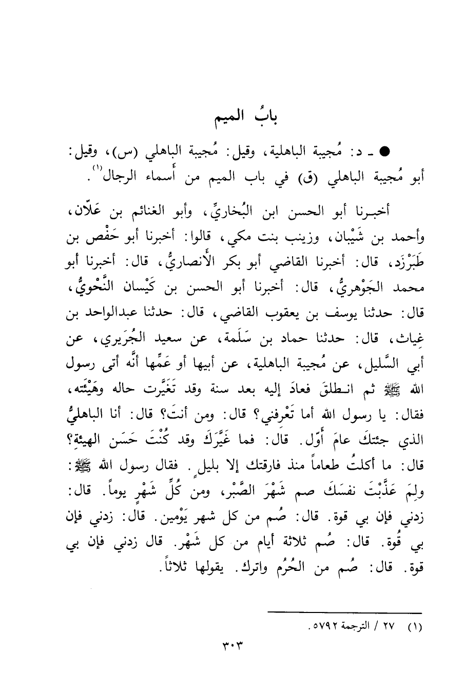 أَخْبَرَنَا أَبُو الْحَسَنِ بْنُ الْبُخَارِيِّ، وأبو الغنائم بْن علان، وأحمد بْن شَيْبَانَ، وزينب بنت مكي، قَالُوا: أَخْبَرَنَا أَبُو حفص بْن طَبَرْزَذَ، قال: أخبرنا الْقَاضِي أَبُو بَكْرٍ الأَنْصارِيّ، قال: أخبرنا أَبُو مُحَمَّدٍ الْجَوْهَرِيُّ، قال: أخبرنا أَبُو الْحَسَنِ بْنِ كَيْسَانَ النَّحْوِيُّ، قال: حَدَّثَنَا يُوسُفُ بْنُ يَعْقُوبَ الْقَاضِي، قال: حَدَّثَنَا عَبْد الْوَاحِدِ بْن غياث، قال: حَدَّثَنَا حماد بْن سلمة، عَنْ سَعِيد الْجَرِيرِيِّ، عَن أَبِي السَّلِيلِ، عَنْ مُجِيبَةَ الْبَاهِلِيَّةِ، عَن أَبِيهَا أَوْ عَمِّهَا أَنَّهُ أَتَى رَسُول اللَّهِ صلى الله عليه وسلم ثُمَّ انْطَلَقَ فَعَادَ إِلَيْهِ بَعْدَ سَنَةٍ وقَدْ تَغَيَّرَتْ حَالُهُ وهَيْئَتُهُ، فَقَالَ: يَا رَسُولَ اللَّهِ أَمَا تَعْرِفُنِي؟ قال: ومَنْ أَنْتَ؟ قال: أَنَا الْبَاهِلِيُّ الَّذِي جِئْتُكَ عَامَ أَوَّلَ. قال: فَمَا غَيَّرَكَ وقَدْ كُنْتَ حَسَنَ الْهَيْئَةِ؟ قال: مَا أَكَلْتُ طَعَامًا مُنْذُ فَارَقْتُكَ إِلا بليلٍ. فَقَالَ رَسُولُ اللَّهِ صَلَّى اللَّهُ عليه وسلم: ولم عَذَّبْتَ نَفْسَكَ صُمْ شَهْرَ الصَّبْرِ، ومِنْ كُلِّ شَهْرٍ يَوْمًا. قال: زِدْنِي فَإِنَّ بِي قُوَّةً. قال: صُمْ مِنْ كُلِّ شَهْرٍ يَوْمَيْنِ.