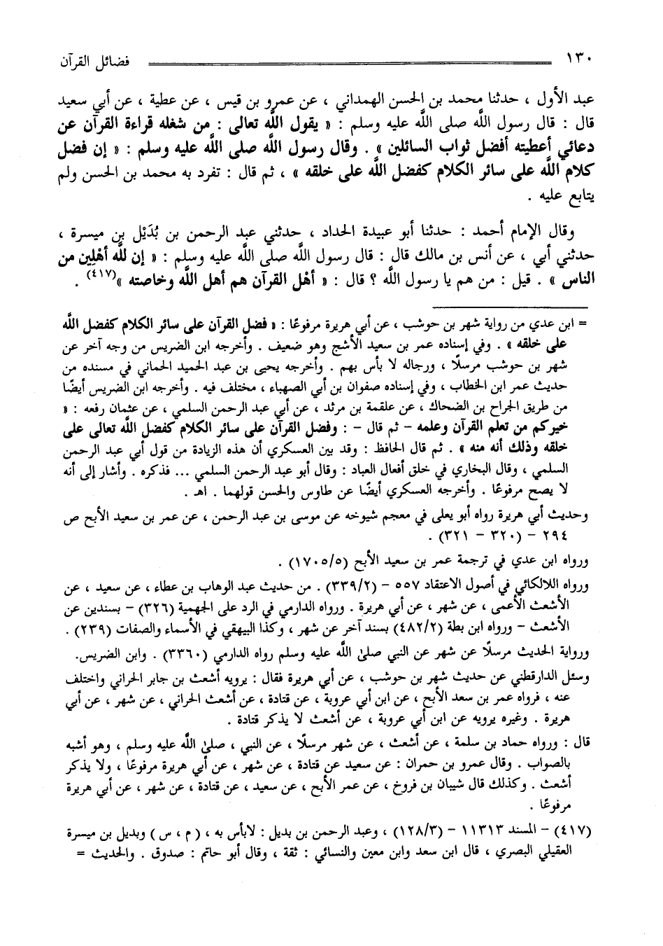 عبد الأول، حدثنا محمد بن الحسن الهمداني، عن عمرو بن قيس، عن عطية، عن أبي سعيد قال: قال رسول الله صلى الله عليه وسلم: " يقول الله تعالى: من شغله قراءة القرآن عن دعائي أعطيته أفضل ثواب السائلين " .