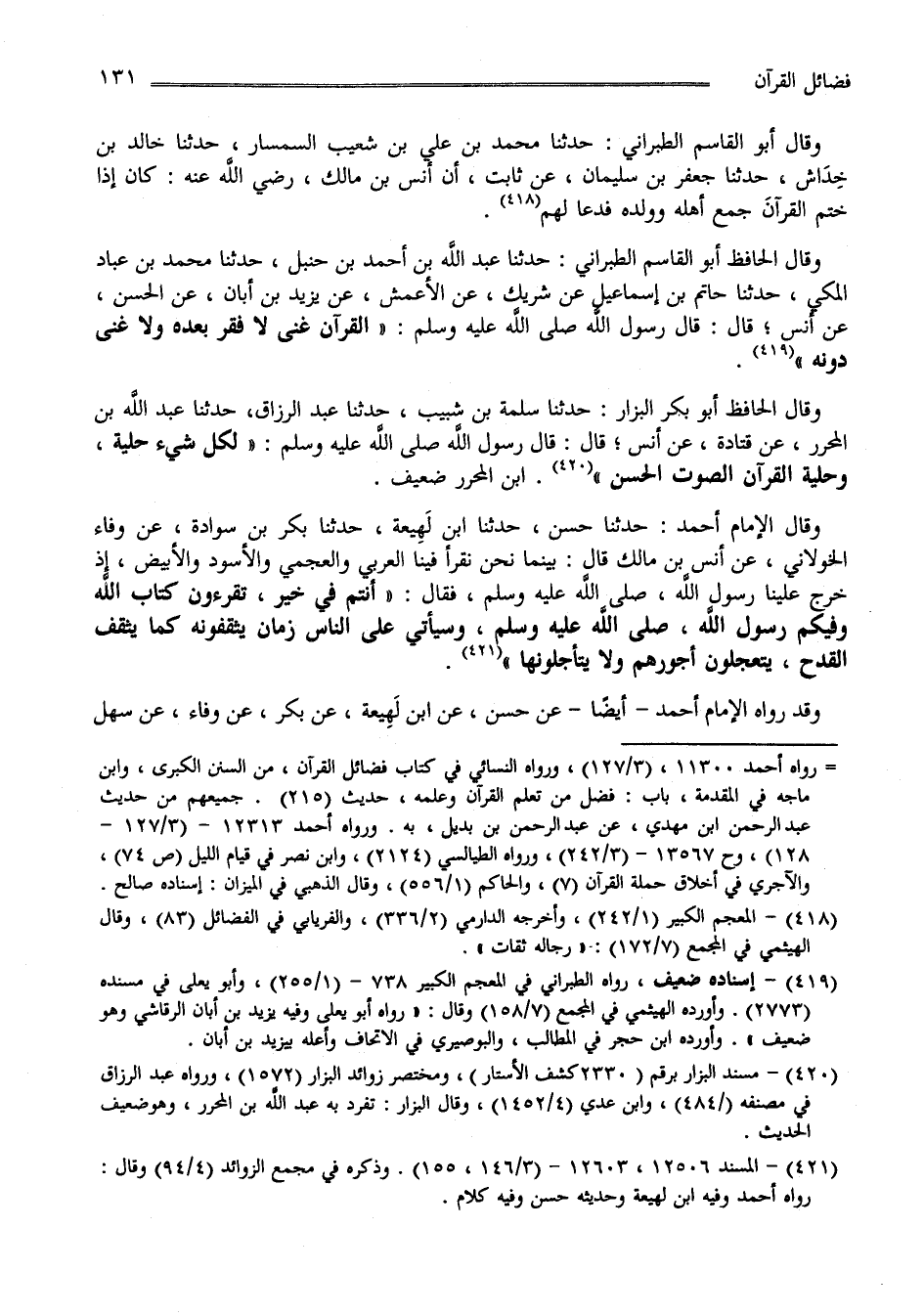 وقال الحافظ أبو القاسم الطبراني: حدثنا عبد الله بن أحمد بن حنبل، حدثنا محمد بن عباد المكي، حدثنا حاتم بن إسماعيل عن شريك، عن الأعمش، عن يزيد بن أبان، عن الحسن، عن أنس قال: قال رسول الله صلى الله عليه وسلم: " القرآن غنى لا فقر بعده ولا غنى دونه " (4) .
