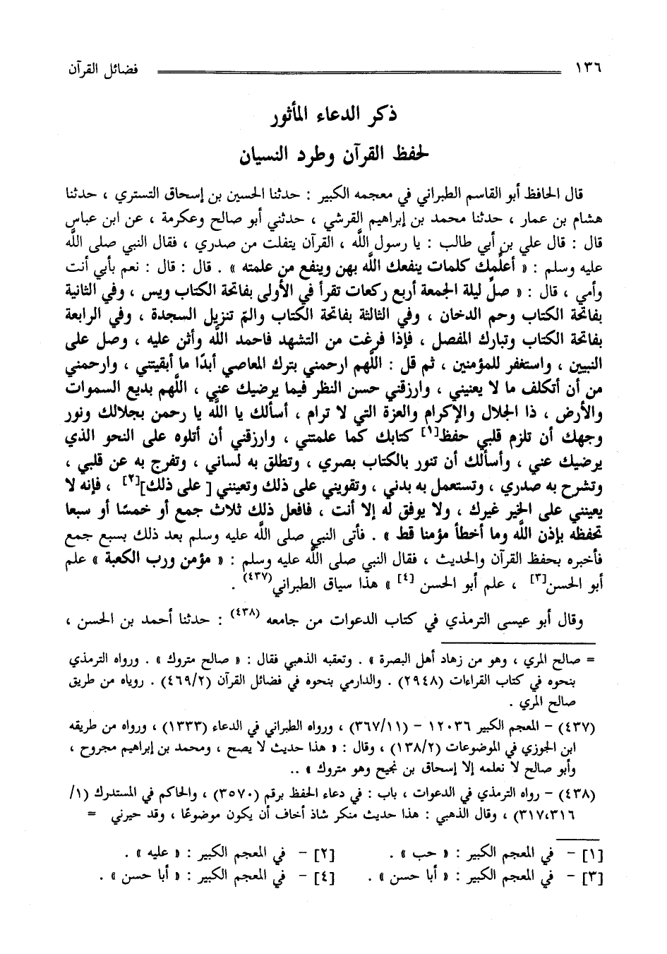 قال [الحافظ] (1) أبو القاسم الطبراني في معجمه الكبير: حدثنا الحسين بن إسحاق التستري، حدثنا هشام بن عمار، حدثنا محمد بن إبراهيم القرشي، حدثنى أبو صالح وعكرمة، عن ابن عباس قال: " قال علي بن أبي طالب: يا رسول الله، القرآن يتفلت من صدري، فقال النبي صلى الله عليه وسلم: "أعلِّمك كلمات ينفعك الله بهن وينفع من علمته". قال: قال: نعم بأبي وأمي، قال: "صلِّ ليلة الجمعة أربع ركعات تقرأ في الأولى بفاتحة الكتاب ويس، وفي الثانية بفاتحة الكتاب وحم الدخان، وفي الثالثة بفاتحة الكتاب والم تنزيل السجدة، وفي الرابعة بفاتحة الكتاب وتبارك المفصل، فإذا فرغت من التشهد فاحمد الله واثن عليه، وصل على النبيين، واستغفر للمؤمنين، ثم قل: اللهم ارحمني بترك المعاصي أبدا ما أبقيتني، وارحمني من أن أتكلف ما لا يعنيني، وارزقني حسن النظر فيما يرضيك عني، اللهم بديع السماوات والأرض، ذا الجلال والإكرام والعزة التي لا ترام، أسألك يا الله يا رحمن بجلالك ونور وجهك أن تلزم قلبي حفظ (2) كتابك كما علمتني، وارزقني أن أتلوه على النحو الذي يرضيك عني، وأسألك أن تنور بالكتاب بصري، وتطلق به لساني، وتفرج به عن قلبي، وتشرح به صدري، وتستعمل به بدني، وتقويني على ذلك وتعينني على ذلك (3) فإنه لا يعينني على الخير غيرك، ولا يوفق له إلا أنت، فافعل ذلك ثلاث جمع أو خمسا أو سبعا تحفظه بإذن الله وما أخطأ مؤمنا قط" . فأتى النبي صلى الله عليه وسلم بعد ذلك بسبع فأخبره بحفظ القرآن والحديث، فقال النبي صلى الله عليه وسلم: "مؤمن ورب الكعبة"، علم أبو الحسن (4) علم أبو الحسن (5) " هذا سياق الطبراني (6) .