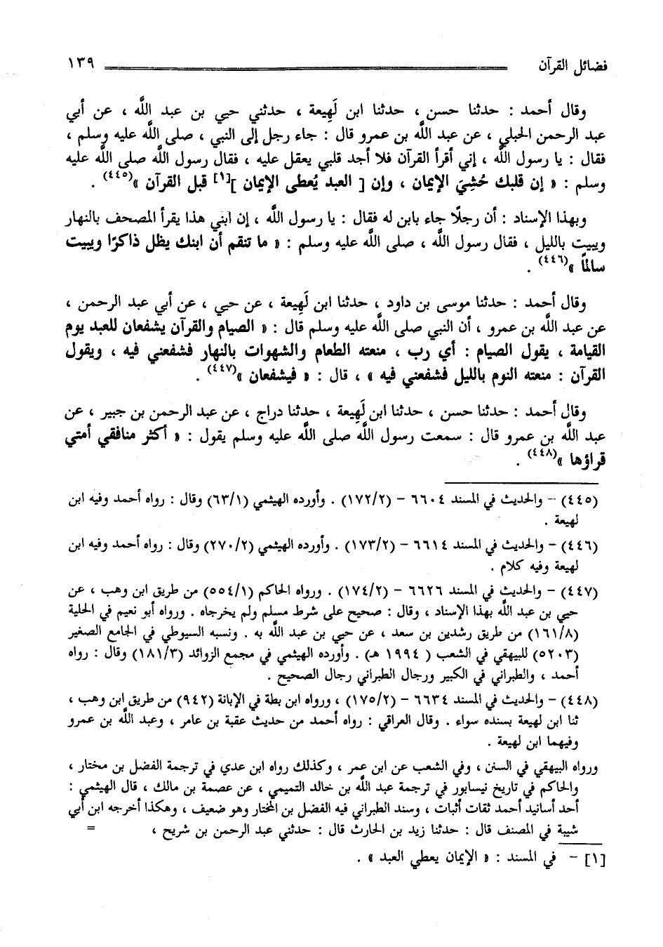 وقال أحمد: حدثنا حسن، حدثنا ابن لَهِيعة، حدثني حيي بن عبد الله، عن أبي عبد الرحمن الحبلي، عن عبد الله بن عمرو قال: جاء رجل إلى النبي (2) صلى الله عليه وسلم فقال: يا رسول الله، إني أقرأ القرآن فلا أجد قلبي يعقل عليه؟ فقال رسول الله صلى الله عليه وسلم: " إن قلبك حُثِيَ الإيمان، وإن العبد يعطى الإيمان قبل القرآن " (3) .