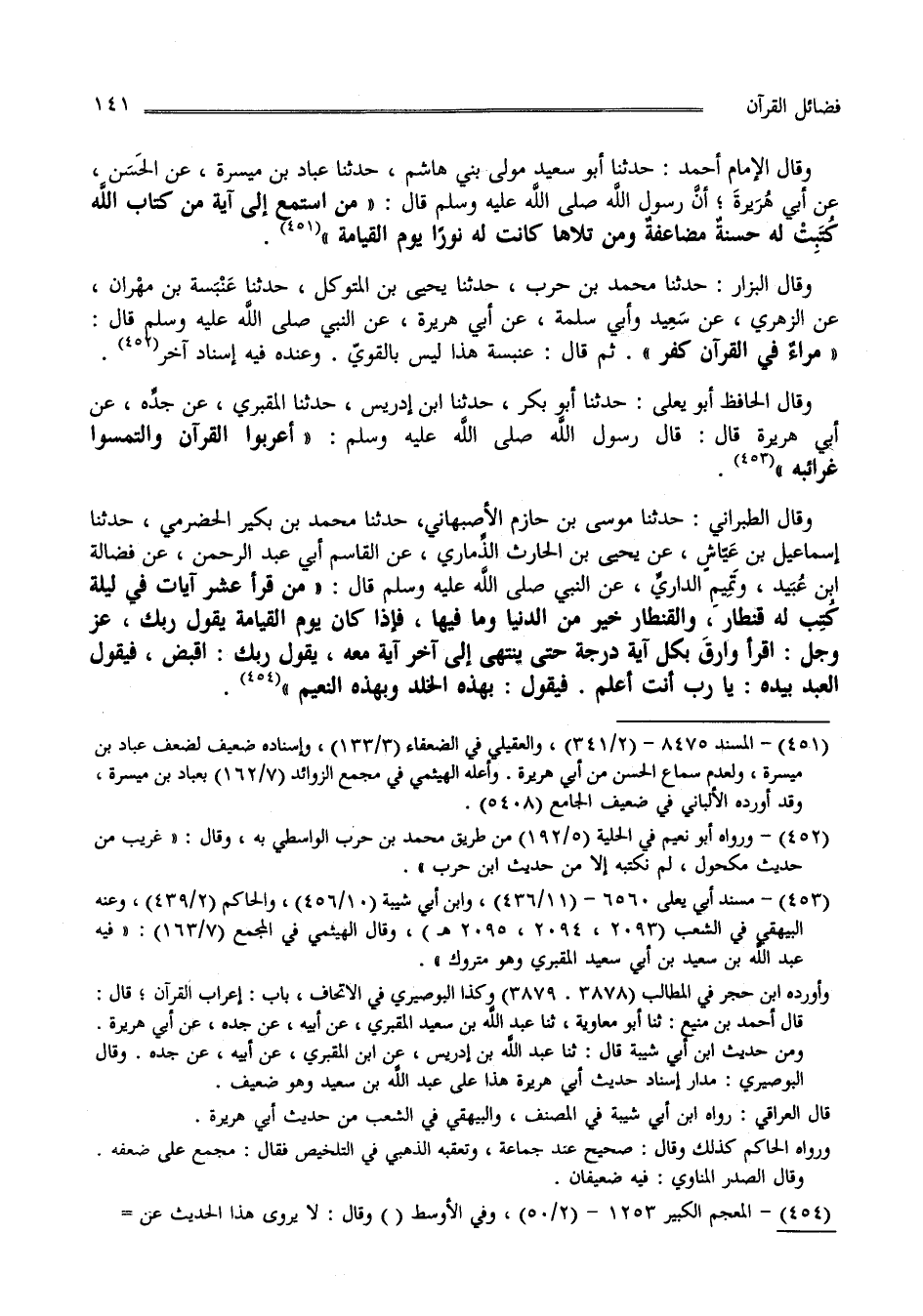 وقال الطبراني: حدثنا موسى بن حازم الأصبهاني، حدثنا محمد بن بكير الحضرمي، حدثنا إسماعيل بن عَيَّاشٍ، عن يحيى بن الحارث الذِّماري، عن القاسم أبي عبد الرحمن، عن فضالة بن عُبَيد، وتَمِيمٍ الداريِّ، عن النبي صلى الله عليه وسلم قال: " من قرأ عشر آيات في ليلة كُتِب له قنطار، والقنطار خير من الدنيا وما فيها، فإذا كان يوم القيامة يقول ربك، عز وجل: اقرأ وارق بكل آية درجة حتى ينتهي إلى آخر آية معه، يقول ربك: اقبض، فيقول العبد بيده: يا رب أنت أعلم. فيقول: بهذه الخلد وبهذه النعيم " (5) .