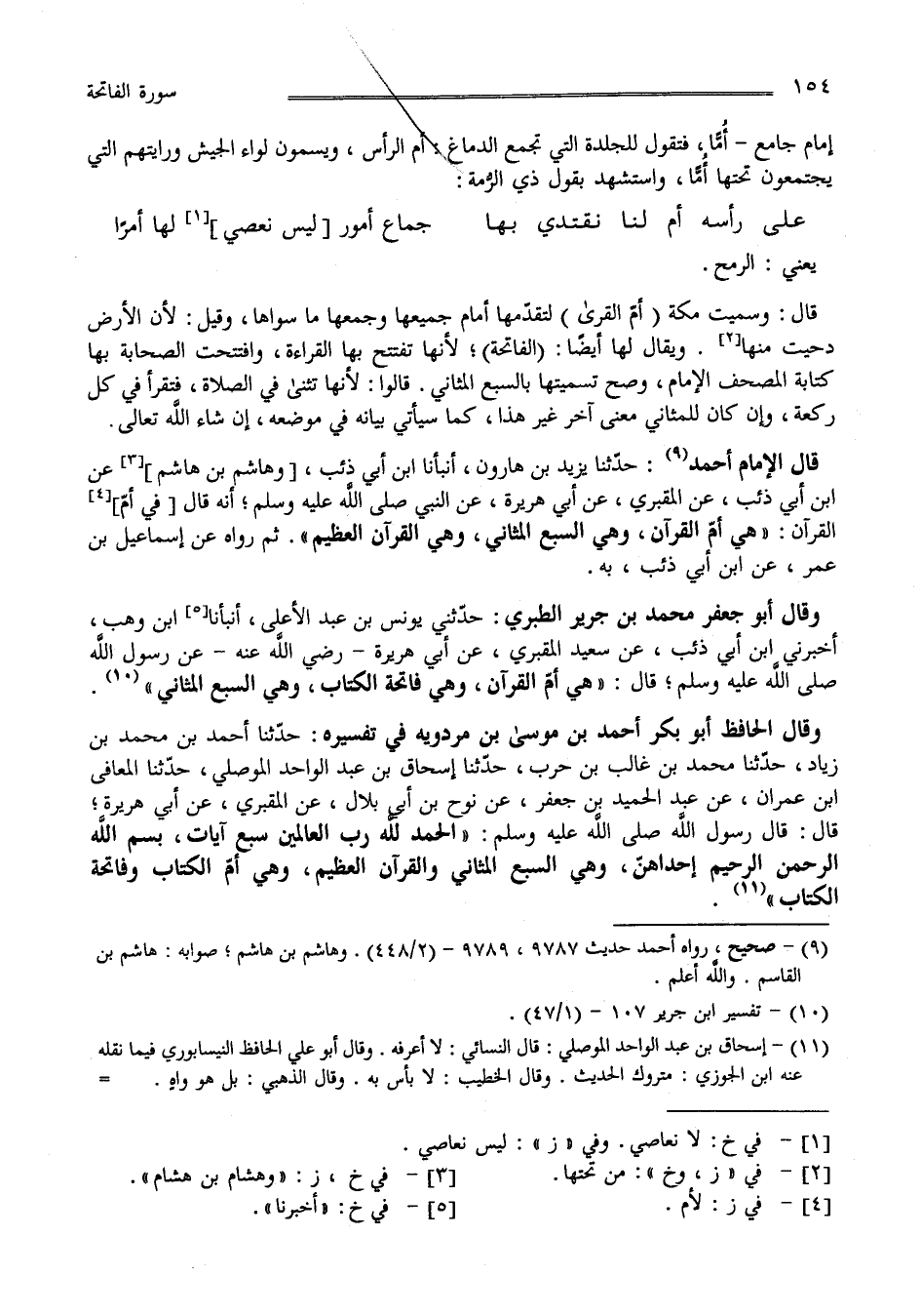 قَالَ الْإِمَام أَحْمَد : حَدَّثَنَا يَزِيد بْن هَارُون أَنْبَأَنَا اِبْن أَبِي ذِئْب وَهَاشِم بْن هَاشِم عَنْ اِبْن أَبِي ذِئْب عَنْ الْمَقْبُرِيّ عَنْ أَبِي هُرَيْرَة عَنْ النَّبِيّ صَلَّى اللَّه عَلَيْهِ وَسَلَّمَ أَنَّهُ قَالَ فِي أُمّ الْقُرْآن " هِيَ أُمّ الْقُرْآن وَهِيَ السَّبْع الْمَثَانِي وَهِيَ الْقُرْآن الْعَظِيم" ثُمَّ رَوَاهُ عَنْ إِسْمَاعِيل بْن عُمَر عَنْ اِبْن أَبِي ذِئْب بِهِ وَقَالَ أَبُو جَعْفَر مُحَمَّد بْن جَرِير الطَّبَرِيّ : حَدَّثَنِي يُونُس بْن عَبْد الْأَعْلَى أَنْبَأَنَا اِبْن وَهْب أَخْبَرَنِي اِبْن أَبِي ذِئْب عَنْ سَعِيد الْمَقْبُرِيّ عَنْ أَبِي هُرَيْرَة رَضِيَ اللَّه عَنْهُ عَنْ رَسُول اللَّه صَلَّى اللَّه عَلَيْهِ وَسَلَّمَ قَالَ " هِيَ أُمّ الْقُرْآن وَهِيَ فَاتِحَة الْكِتَاب وَهِيَ السَّبْع الْمَثَانِي " وَقَالَ الْحَافِظ أَبُو بَكْر أَحْمَد بْن مُوسَى بْن مَرْدَوَيْهِ فِي تَفْسِيره حَدَّثَنَا أَحْمَد بْن مُحَمَّد بْن زِيَاد حَدَّثَنَا مُحَمَّد بْن غَالِب بْن حَارِث حَدَّثَنَا إِسْحَاق بْن عَبْد الْوَاحِد الْمَوْصِلِيّ حَدَّثَنَا الْمُعَافَى بْن عِمْرَان عَنْ عَبْد الْحَمِيد بْن جَعْفَر عَنْ نُوح بْن أَبِي بِلَال عَنْ الْمَقْبُرِيّ عَنْ أَبِي هُرَيْرَة قَالَ : قَالَ رَسُول اللَّه صَلَّى اللَّه عَلَيْهِ وَسَلَّمَ " الْحَمْد لِلَّهِ رَبّ الْعَالَمِينَ سَبْع آيَات : بِسْمِ اللَّه الرَّحْمَن الرَّحِيم إِحْدَاهُنَّ وَهِيَ السَّبْع الْمَثَانِي وَالْقُرْآن الْعَظِيم وَهِيَ أُمّ الْكِتَاب وَفَاتِحَة الْكِتَاب "