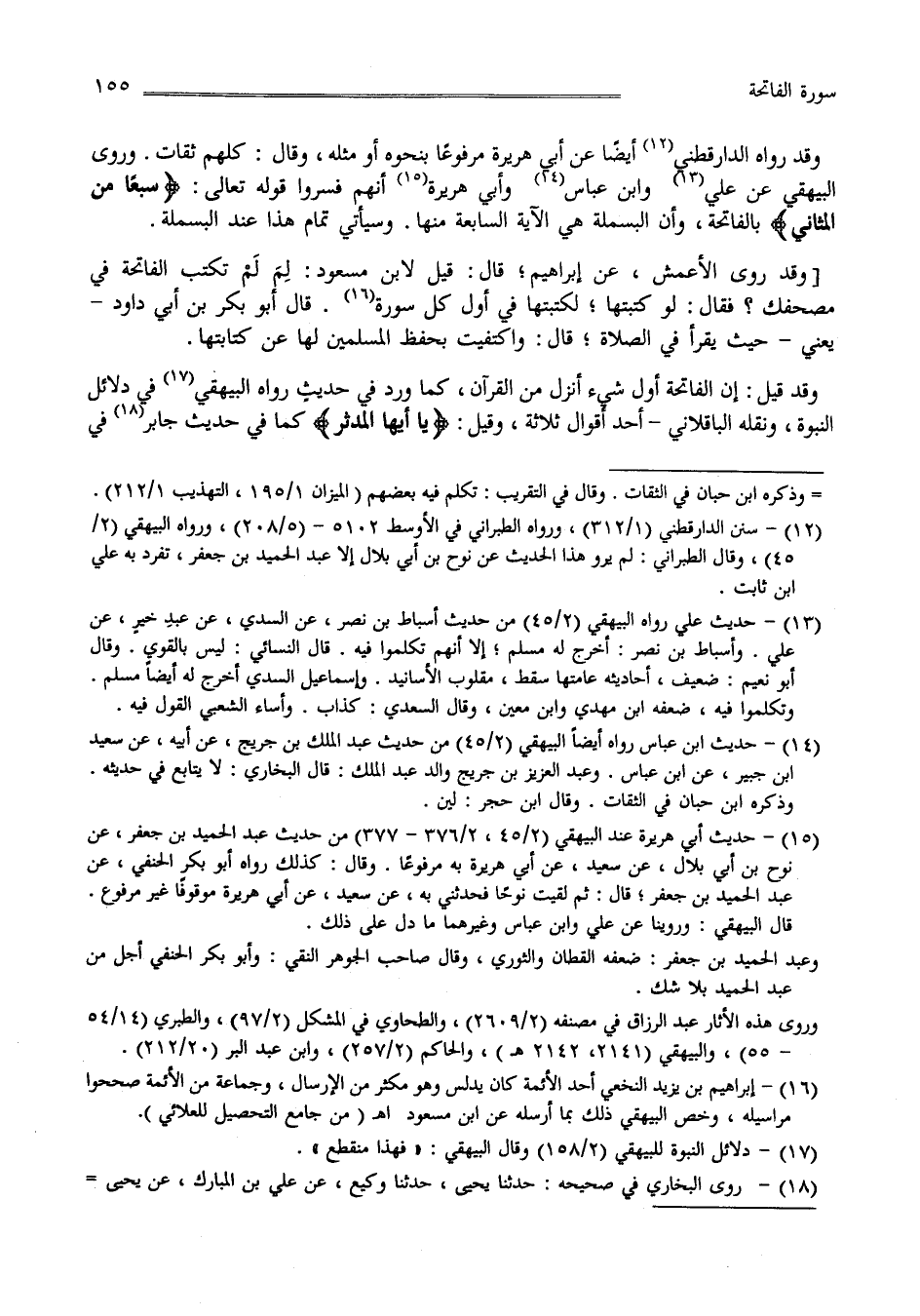 وَقَدْ رَوَاهُ الدَّارَقُطْنِيّ أَيْضًا عَنْ أَبِي هُرَيْرَة مَرْفُوعًا بِنَحْوِهِ أَوْ مِثْله وَقَالَ كُلّهمْ ثِقَات وَرَوَى الْبَيْهَقِيّ عَنْ عَلِيّ وَابْن عَبَّاس وَأَبِي هُرَيْرَة أَنَّهُمْ فَسَّرُوا قَوْله تَعَالَى : " سَبْعًا مِنْ الْمَثَانِي " بِالْفَاتِحَةِ وَأَنَّ الْبَسْمَلَة هِيَ الْآيَة السَّابِعَة مِنْهَا وَسَيَأْتِي تَمَام هَذَا عِنْد الْبَسْمَلَة.