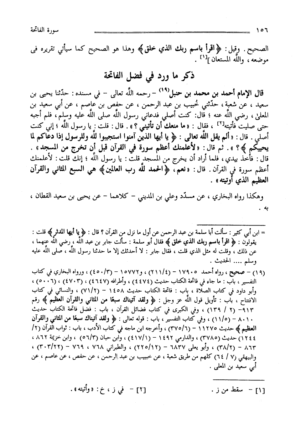 ذِكْر مَا وَرَدَ فِي فَضْل الْفَاتِحَة " قَالَ الْإِمَام أَحْمَد بْن مُحَمَّد بْن حَنْبَل رَحِمَهُ اللَّه تَعَالَى فِي مُسْنَده : حَدَّثَنَا يَحْيَى بْن سَعِيد عَنْ شُعَبَة حَدَّثَنِي حَبِيب بْن عَبْد الرَّحْمَن عَنْ حَفْص بْن عَاصِم عَنْ أَبِي سَعِيد بْن الْمُعَلَّى رَضِيَ اللَّه عَنْهُ قَالَ : كُنْت أُصَلِّي فَدَعَانِي رَسُول اللَّه صَلَّى اللَّه عَلَيْهِ وَسَلَّمَ فَلَمْ أُجِبْهُ حَتَّى صَلَّيْت قَالَ : فَأَتَيْته فَقَالَ " مَا مَنَعَك أَنْ تَأْتِيَنِي ؟ " قَالَ قُلْت : يَا رَسُولَ اللَّه إِنِّي كُنْت أُصَلِّي قَالَ : أَلَمْ يَقُلْ اللَّه تَعَالَى : " يَا أَيّهَا الَّذِينَ آمَنُوا اِسْتَجِيبُوا لِلَّهِ وَلِلرَّسُولِ إِذَا دَعَاكُمْ لِمَا يُحْيِيكُمْ " ثُمَّ قَالَ " لَأُعَلِّمَنَّك أَعْظَم سُورَة فِي الْقُرْآن قَبْل أَنْ تَخْرُج مِنْ الْمَسْجِد " قَالَ : فَأَخَذَ بِيَدِي فَلَمَّا أَرَادَ أَنْ يَخْرُج مِنْ الْمَسْجِد قُلْت : يَا رَسُول اللَّه إِنَّك قُلْت لَأُعَلِّمَنَّك أَعْظَم سُورَة فِي الْقُرْآن قَالَ " نَعَمْ" الْحَمْد لِلَّهِ رَبّ الْعَالَمِينَ " هِيَ السَّبْع الْمَثَانِي وَالْقُرْآن الْعَظِيم الَّذِي أُوتِيته " وَهَكَذَا رَوَاهُ الْبُخَارِيّ عَنْ مُسَدَّد وَعَلِيّ بْن الْمَدِينِيّ كِلَاهُمَا عَنْ يَحْيَى بْن سَعِيد الْقَطَّان بِهِ
