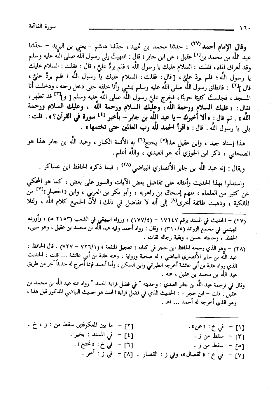 وَقَالَ الْإِمَام أَحْمَد حَدَّثَنَا مُحَمَّد بْن عُبَيْد حَدَّثَنَا هَاشِم يَعْنِي بْن الْبَرِيد حَدَّثَنَا عَبْد اللَّه بْن مُحَمَّد بْن عَقِيل عَنْ [ اِبْن ] جَابِر قَالَ اِنْتَهَيْت إِلَى رَسُول اللَّه صَلَّى اللَّه عَلَيْهِ وَسَلَّمَ وَقَدْ أَهَرَاقَ الْمَاء فَقُلْت السَّلَام عَلَيْك يَا رَسُول اللَّه فَلَمْ يَرُدّ عَلَيَّ قَالَ فَقُلْت السَّلَام عَلَيْك يَا رَسُول اللَّه فَلَمْ يَرُدّ عَلَيَّ قَالَ فَقُلْت السَّلَام عَلَيْك يَا رَسُول اللَّه فَلَمْ يَرُدّ عَلَيَّ قَالَ فَانْطَلَقَ رَسُول اللَّه صَلَّى اللَّه عَلَيْهِ وَسَلَّمَ يَمْشِي وَأَنَا خَلْفه حَتَّى دَخَلَ رَحْله وَدَخَلْت أَنَا الْمَسْجِد فَجَلَسْت كَئِيبًا حَزِينًا فَخَرَجَ عَلَيَّ رَسُول اللَّه صَلَّى اللَّه عَلَيْهِ وَسَلَّمَ وَقَدْ تَطَهَّرَ فَقَالَ " عَلَيْك السَّلَام وَرَحْمَة اللَّه وَبَرَكَاته وَعَلَيْك السَّلَام وَرَحْمَة اللَّه وَبَرَكَاته وَعَلَيْك السَّلَام وَرَحْمَة اللَّه " ثُمَّ قَالَ " أَلَا أُخْبِرُك يَا عَبْد اللَّه بْن جَابِر بِأَخْيَر سُورَة فِي الْقُرْآن ؟ قُلْت بَلَى يَا رَسُول اللَّه قَالَ اِقْرَأْ الْحَمْد لِلَّهِ رَبّ الْعَالَمِينَ حَتَّى تَخْتِمهَا " هَذَا إِسْنَاد جَيِّد وَابْن عَقِيل هَذَا يَحْتَجّ بِهِ الْأَئِمَّة الْكِبَار وَعَبْد اللَّه بْن جَابِر هَذَا الصَّحَابِيّ ذَكَرَ اِبْن الْجَوْزِيّ أَنَّهُ هُوَ الْعَبْدِيّ وَاَللَّه أَعْلَم وَيُقَال إِنَّهُ عَبْد اللَّه بْن جَابِر الْأَنْصَارِيّ الْبَيَاضِيّ فِيمَا ذَكَرَه الْحَافِظ اِبْن عَسَاكِر وَاسْتَدَلُّوا بِهَذَا الْحَدِيث وَأَمْثَاله عَلَى تَفَاضُل بَعْض الْآيَات وَالسُّوَر عَلَى بَعْض كَمَا هُوَ الْمَحْكِيّ عَنْ كَثِير مِنْ الْعُلَمَاء مِنْهُمْ إِسْحَاق بْن رَاهْوَيْهِ وَأَبُو بَكْر بْن الْعَرَبِيّ وَابْن الْحَفَّار مِنْ الْمَالِكِيَّة وَذَهَبَتْ طَائِفَة أُخْرَى إِلَى أَنَّهُ لَا