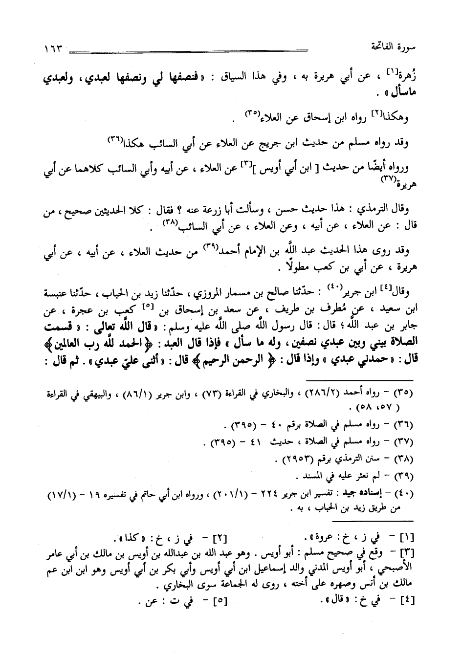 زُهْرَة عَنْ أَبِي هُرَيْرَة وَفِي هَذَا السِّيَاق " فَنِصْفهَا لِي وَنِصْفهَا لِعَبْدِي وَلِعَبْدِي مَا سَأَلَ " وَهَكَذَا رَوَاهُ اِبْن إِسْحَاق عَنْ الْعَلَاء وَقَدْ رَوَاهُ مُسْلِم مِنْ حَدِيث اِبْن جُرَيْج عَنْ الْعَلَاء عَنْ أَبِي السَّائِب هَكَذَا وَرَوَاهُ أَيْضًا مِنْ حَدِيث اِبْن أَبِي أُوَيْس عَنْ الْعَلَاء عَنْ أَبِيهِ وَأَبِي السَّائِب كِلَاهُمَا عَنْ أَبِي هُرَيْرَة وَقَالَ التِّرْمِذِيّ هَذَا حَدِيث حَسَن وَسَأَلْت أَبَا زُرْعَة عَنْهُ فَقَالَ كِلَا الْحَدِيثَيْنِ صَحِيح مَنْ قَالَ عَنْ الْعَلَاء عَنْ أَبِي السَّائِب وَعَنْ الْعَلَاء عَنْ أَبِيهِ وَقَدْ رَوَى هَذَا الْحَدِيث عَبْد اللَّه اِبْن الْإِمَام أَحْمَد مِنْ حَدِيث الْعَلَاء عَنْ أَبِيهِ عَنْ أَبِي هُرَيْرَة عَنْ أُبَيّ بْن كَعْب مُطَوَّلًا وَقَالَ اِبْن جَرِير حَدَّثَنَا صَالِح بْن مِسْمَار الْمَرْوَزِيّ