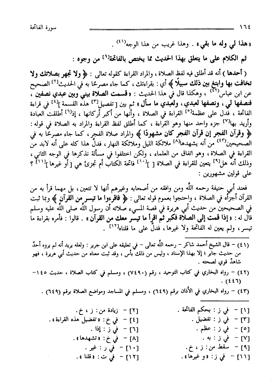 " الْكَلَام عَلَى مَا يَتَعَلَّق بِهَذَا الْحَدِيث مِمَّا يَخْتَصّ بِالْفَاتِحَةِ مِنْ وُجُوه " " أَحَدهَا" أَنَّهُ قَدْ أُطْلِق فِيهِ لَفْظ الصَّلَاة وَالْمُرَاد الْقِرَاءَة كَقَوْلِهِ تَعَالَى : " وَلَا تَجْهَر بِصَلَاتِك وَلَا تُخَافِت بِهَا وَابْتَغِ بَيْن ذَلِكَ سَبِيلًا " أَيْ بِقِرَاءَتِك كَمَا جَاءَ مُصَرَّحًا بِهِ فِي الصَّحِيح عَنْ اِبْن عَبَّاس وَهَكَذَا قَالَ فِي هَذَا الْحَدِيث" قَسَمْت الصَّلَاة بَيْنِي وَبَيْن عَبْدِي نِصْفَيْنِ فَنِصْفهَا لِي وَنِصْفهَا لِعَبْدِي وَلِعَبْدِي مَا سَأَلَ " ثُمَّ بَيَّنَ تَفْصِيل هَذِهِ الْقِسْمَة فِي قِرَاءَة الْفَاتِحَة فَدَلَّ عَلَى عَظَمَة الْقِرَاءَة فِي الصَّلَاة وَأَنَّهَا مِنْ أَكْبَر أَرْكَانهَا إِذْ أُطْلِقَتْ الْعِبَادَة وَأُرِيد بِهَا جُزْء وَاحِد مِنْهَا وَهُوَ الْقِرَاءَة كَمَا أُطْلِق لَفْظ الْقِرَاءَة وَالْمُرَاد بِهِ الصَّلَاة فِي قَوْله" وَقُرْآن الْفَجْر إِنَّ قُرْآن الْفَجْر كَانَ مَشْهُودًا " وَالْمُرَاد صَلَاة الْفَجْر كَمَا جَاءَ مُصَرَّحًا بِهِ فِي الصَّحِيحَيْنِ أَنَّهُ يَشْهَدهَا مَلَائِكَة اللَّيْل وَمَلَائِكَة النَّهَار فَدَلَّ هَذَا كُلّه عَلَى أَنَّهُ لَا بُدّ مِنْ الْقِرَاءَة فِي الصَّلَاة وَهُوَ اِتِّفَاق مِنْ الْعُلَمَاء وَلَكِنْ اِخْتَلَفُوا فِي مَسْأَلَة نَذْكُرهَا فِي الْوَجْه الثَّانِي وَذَلِكَ أَنَّهُ هَلْ يَتَعَيَّن لِلْقِرَاءَةِ فِي الصَّلَاة غَيْر فَاتِحَة الْكِتَاب أَمْ تُجْزِئ هِيَ أَوْ غَيْرهَا ؟ عَلَى قَوْلَيْنِ مَشْهُورَيْنِ فَعِنْد أَبَى حَنِيفَة وَمَنْ وَافَقَهُ مِنْ أَصْحَابه وَغَيْرهمْ : أَنَّهَا لَا تَتَعَيَّن بَلْ مَهْمَا قَرَأَ بِهِ مِنْ الْقُرْآن أَجْزَأَهُ فِي الصَّلَاة وَاحْتَجُّوا بِعُمُومِ قَوْله تَعَالَى : " فَاقْرَءُوا مَا تَيَسَّرَ مِنْ الْقُرْآن " وَبِمَا ثَبَتَ فِي الصَّحِيحَيْنِ مِنْ حَدِيث أَبِي هُرَيْرَة فِي قِصَّة الْمُسِيء فِي صَلَاته أَنَّ رَسُول اللَّه صَلَّى اللَّه عَلَيْهِ وَسَلَّمَ قَالَ لَهُ " إِذَا قُمْت إِلَى الصَّلَاة فَكَبِّرْ ثُمَّ اِقْرَأْ مَا تَيَسَّرَ مَعَك مِنْ الْقُرْآن " قَالُوا فَأَمَرَهُ بِقِرَاءَةِ مَا تَيَسَّرَ وَلَمْ يُعَيِّنْ لَهُ الْفَاتِحَة وَلَا غَيْرهَا فَدَلَّ عَلَى مَا قُلْنَا .