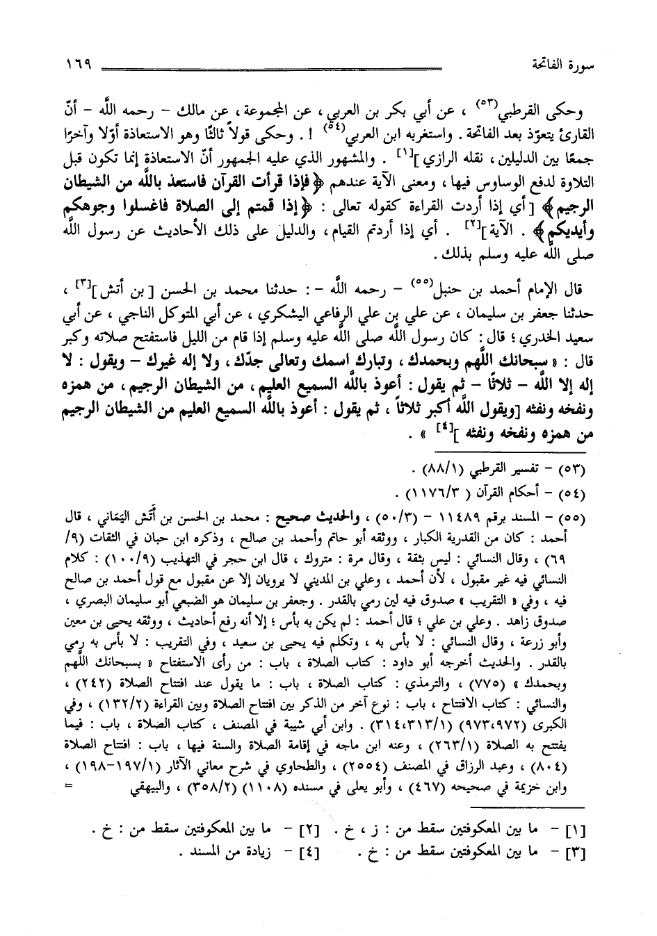 قَالَ الْإِمَام أَحْمَد بْن حَنْبَل رَحِمَهُ اللَّه حَدَّثَنَا مُحَمَّد بْن الْحَسَن بْن أَنَس حَدَّثَنَا جَعْفَر بْن سُلَيْمَان عَنْ عَلِيّ بْن عَلِيّ الرِّفَاعِيّ الْيَشْكُرِيّ عَنْ أَبِي الْمُتَوَكِّل النَّاجِيّ عَنْ أَبِي سَعِيد الْخُدْرِيّ قَالَ : كَانَ رَسُول اللَّه صَلَّى اللَّه عَلَيْهِ وَسَلَّمَ إِذَا قَامَ مِنْ اللَّيْل فَاسْتَفْتَحَ صَلَاته وَكَبَّرَ قَالَ " سُبْحَانك اللَّهُمَّ وَبِحَمْدِك وَتَبَارَكَ اِسْمك وَتَعَالَى جَدّك وَلَا إِلَه غَيْرك - ثُمَّ يَقُول - لَا إِلَه إِلَّا اللَّه ثَلَاثًا ثُمَّ يَقُول أَعُوذ بِاَللَّهِ السَّمِيع الْعَلِيم مِنْ الشَّيْطَان الرَّجِيم مِنْ هَمْزه وَنَفْخه وَنَفْثه "