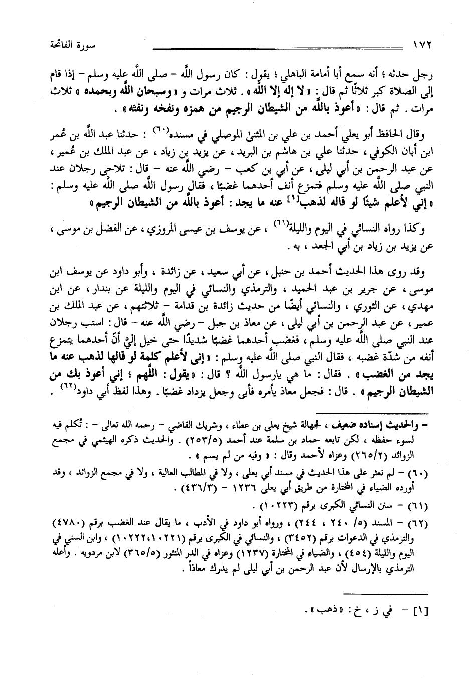 رَجُل حَدَّثَهُ أَنَّهُ سَمِعَ أَبَا أُمَامَةَ الْبَاهِلِيّ يَقُول : كَانَ رَسُول اللَّه صَلَّى اللَّه عَلَيْهِ وَسَلَّمَ إِذَا قَامَ إِلَى الصَّلَاة كَبَّرَ ثَلَاثًا ثُمَّ قَالَ " لَا إِلَه إِلَّا اللَّه ثَلَاث مَرَّات وَسُبْحَان اللَّه وَبِحَمْدِهِ ثَلَاث مَرَّات " ثُمَّ قَالَ " أَعُوذ بِاَللَّهِ مِنْ الشَّيْطَان الرَّجِيم مِنْ هَمْزه وَنَفْخه وَنَفْثه " وَقَالَ الْحَافِظ أَبُو يَعْلَى أَحْمَد بْن عَلِيّ بْن الْمُثَنَّى الْمَوْصِلِيّ فِي مُسْنَده حَدَّثَنَا عَبْد اللَّه بْن عُمَر بْن أَبَانَ الْكُوفِيّ حَدَّثَنَا عَلِيّ بْن هِشَام بْن الْبَرِيد عَنْ يَزِيد بْن زِيَاد عَنْ عَبْد الْمَلِك بْن عُمَيْر عَنْ عَبْد الرَّحْمَن بْن أَبِي لَيْلَى عَنْ أُبَيّ بْن كَعْب رَضِيَ اللَّه عَنْهُ قَالَ : تَلَاحَى رَجُلَانِ عِنْد النَّبِيّ صَلَّى اللَّه عَلَيْهِ وَسَلَّمَ فَتَمَزَّعَ أَنْف أَحَدهمَا غَضَبًا فَقَالَ رَسُول اللَّه صَلَّى اللَّه عَلَيْهِ وَسَلَّمَ" إِنِّي لَأَعْلَم شَيْئًا لَوْ قَالَهُ لَذَهَبَ عَنْهُ مَا يَجِد : أَعُوذ بِاَللَّهِ مِنْ الشَّيْطَان الرَّجِيم " وَكَذَا رَوَاهُ النَّسَائِيّ فِي الْيَوْم وَاللَّيْلَة عَنْ يُوسُف بْن عِيسَى الْمَرْوَزِيّ عَنْ الْفَضْل بْن مُوسَى عَنْ يَزِيد بْن زِيَاد بْن أَبِي الْجَعْدِيَّة وَقَدْ رَوَى هَذَا الْحَدِيث أَحْمَد بْن حَنْبَل عَنْ أَبِي سَعِيد عَنْ زَائِدَة , وَأَبُو دَاوُدَ عَنْ يُوسُف بْن مُوسَى عَنْ جَرِير بْن عَبْد الْحَمِيد وَالتِّرْمِذِيّ وَالنَّسَائِيّ فِي الْيَوْم وَاللَّيْلَة عَنْ بُنْدَار عَنْ اِبْن مَهْدِيّ عَنْ الثَّوْرِيّ وَالنَّسَائِيّ أَيْضًا مِنْ حَدِيث زَائِدَة بْن قُدَامَةَ ثَلَاثَتهمْ عَنْ عَبْد الْمَلِك بْن عُمَيْر عَنْ عَبْد الرَّحْمَن بْن أَبِي لَيْلَى عَنْ مُعَاذ بْن جَبَل رَضِيَ اللَّه عَنْهُ قَالَ : اِسْتَبَّ رَجُلَانِ عِنْد النَّبِيّ صَلَّى اللَّه عَلَيْهِ وَسَلَّمَ فَغَضِبَ أَحَدهمَا غَضَبًا شَدِيدًا حَتَّى يُخَيَّل إِلَيَّ أَنَّ أَحَدهمَا يَتَمَزَّع أَنْفه مِنْ شِدَّة غَضَبه فَقَالَ النَّبِيّ صَلَّى اللَّه عَلَيْهِ وَسَلَّمَ " إِنِّي لَأَعْلَم كَلِمَة لَوْ قَالَهَا لَذَهَبَ عَنْهُ مَا يَجِد مِنْ الْغَضَب " فَقَالَ : مَا هِيَ يَا رَسُول اللَّه ؟ قَالَ" يَقُول اللَّهُمَّ إِنِّي أَعُوذ بِك مِنْ الشَّيْطَان الرَّجِيم " قَالَ : فَجَعَلَ مُعَاذ يَأْمُرهُ فَأَبَى وَجَعَلَ يَزْدَاد غَضَبًا وَهَذَا لَفْظ أَبِي دَاوُدَ