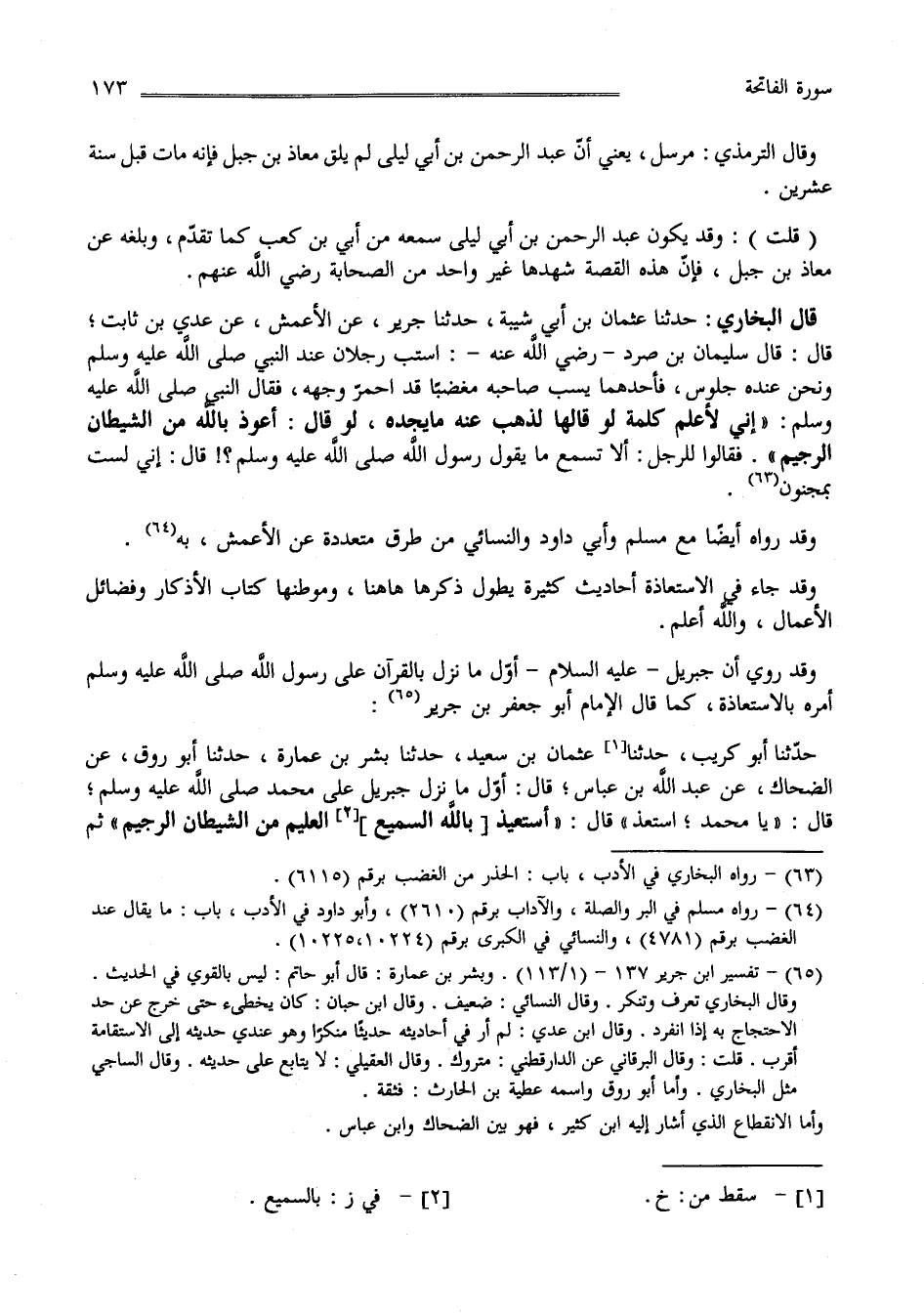 وَقَالَ التِّرْمِذِيّ : مُرْسَل يَعْنِي أَنَّ عَبْد الرَّحْمَن بْن أَبِي لَيْلَى لَمْ يَلْقَ مُعَاذ بْن جَبَل فَإِنَّهُ مَاتَ قَبْل سَنَة عِشْرِينَ " قُلْت " وَقَدْ يَكُون عَبْد الرَّحْمَن بْن أَبِي لَيْلَى سَمِعَهُ مِنْ أُبَيّ بْن كَعْب كَمَا تَقَدَّمَ وَبَلَغَهُ عَنْ مُعَاذ بْن جَبَل فَإِنَّ هَذِهِ الْقِصَّة شَهِدَهَا غَيْر وَاحِد مِنْ الصَّحَابَة رَضِيَ اللَّه عَنْهُمْ .