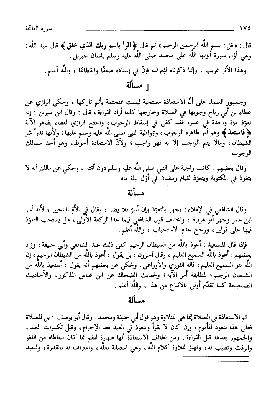 " مَسْأَلَة" وَجُمْهُور الْعُلَمَاء عَلَى أَنَّ الِاسْتِعَاذَة مُسْتَحَبَّة لَيْسَتْ بِمُتَحَتِّمَةٍ يَأْثَم تَارِكهَا وَحَكَى الرَّازِيّ عَنْ عَطَاء بْن أَبِي رَبَاح وُجُوبهَا فِي الصَّلَاة وَخَارِجهَا كُلَّمَا أَرَادَ الْقِرَاءَة قَالَ : وَقَالَ اِبْن سِيرِينَ : إِذَا تَعَوَّذَ مَرَّة وَاحِدَة فِي عُمْره فَقَدْ كَفَى فِي إِسْقَاط الْوُجُوب وَاحْتَجَّ الرَّازِيّ لِعَطَاءٍ بِظَاهِرِ الْآيَة " فَاسْتَعِذْ " وَهُوَ أَمْر ظَاهِره الْوُجُوب وَبِمُوَاظَبَةِ النَّبِيّ صَلَّى اللَّه عَلَيْهِ وَسَلَّمَ عَلَيْهَا وَلِأَنَّهَا تَدْرَأ شَرّ الشَّيْطَان وَمَا لَا يَتِمّ الْوَاجِب إِلَّا بِهِ فَهُوَ وَاجِب وَلِأَنَّ الِاسْتِعَاذَة أَحْوَط وَهُوَ أَحَد مَسَالِك الْوُجُوب وَقَالَ بَعْضهمْ : كَانَتْ وَاجِبَة عَلَى النَّبِيّ صَلَّى اللَّه عَلَيْهِ وَسَلَّمَ دُون أُمَّته وَحُكِيَ عَنْ مَالِك أَنَّهُ لَا يَتَعَوَّذ فِي الْمَكْتُوبَة وَيَتَعَوَّذ لِقِيَامِ رَمَضَان فِي أَوَّل لَيْلَة مِنْهُ .