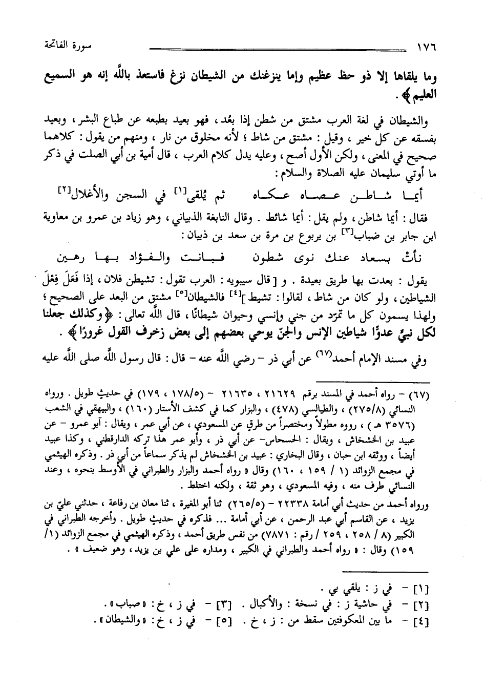 وَمَا يُلَقَّاهَا إِلَّا ذُو حَظّ عَظِيم وَإِمَّا يَنْزَغَنَّك مِنْ الشَّيْطَان نَزْغ فَاسْتَعِذْ بِاَللَّهِ إِنَّهُ هُوَ السَّمِيع الْعَلِيم " .