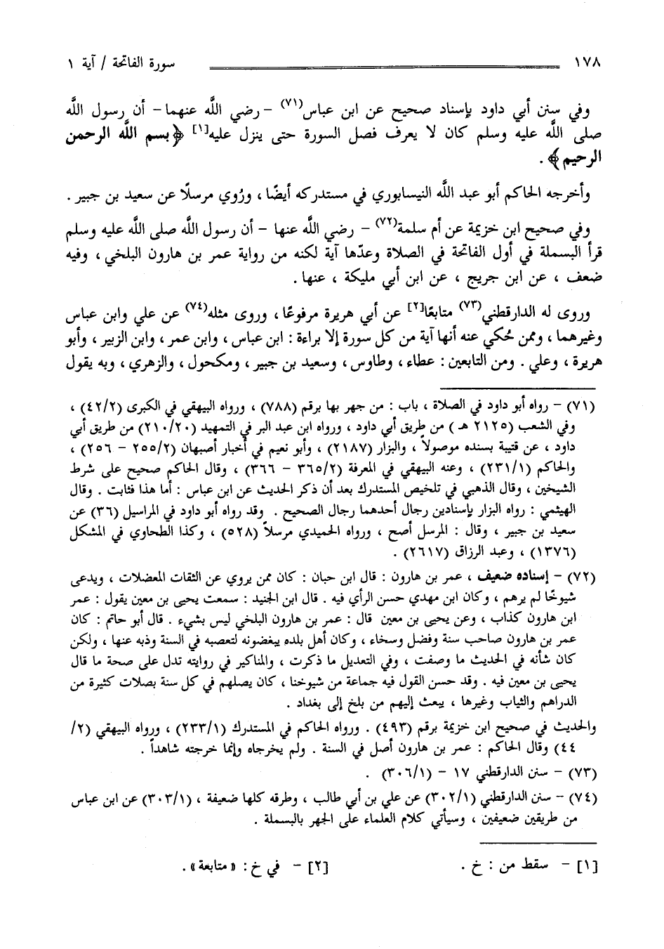 وَفِي سُنَن أَبِي دَاوُدَ بِإِسْنَادٍ صَحِيحٍ عَنْ اِبْن عَبَّاس رَضِيَ اللَّه عَنْهُمَا أَنَّ رَسُولَ اللَّه صَلَّى اللَّه عَلَيْهِ وَسَلَّمَ كَانَ لَا يَعْرِف فَصْل السُّورَة حَتَّى يَنْزِل عَلَيْهِ " بِسْمِ اللَّه الرَّحْمَن الرَّحِيم " وَأَخْرَجَهُ الْحَاكِم أَبُو عَبْد اللَّه النَّيْسَابُورِيّ فِي مُسْتَدْرَكه أَيْضًا وَرُوِيَ مُرْسَلًا عَنْ سَعِيد بْن جُبَيْر وَفِي صَحِيح اِبْن خُزَيْمَةَ عَنْ أُمّ سَلَمَة رَضِيَ اللَّه عَنْهَا أَنَّ رَسُولَ اللَّه صَلَّى اللَّه عَلَيْهِ وَسَلَّمَ قَرَأَ الْبَسْمَلَة فِي أَوَّل الْفَاتِحَة فِي الصَّلَاة وَعَدَّهَا آيَة لَكِنَّهُ مِنْ رِوَايَة عُمَر بْن هَارُون الْبَلْخِيّ وَفِيهِ ضَعْف عَنْ اِبْن جُرَيْج عَنْ اِبْن أَبِي مُلَيْكَة عَنْهَا وَرَوَى لَهُ الدَّارَقُطْنِيّ مُتَابِعًا عَنْ أَبِي هُرَيْرَة مَرْفُوعًا وَرَوَى مِثْله عَنْ عَلِيّ وَابْن عَبَّاس وَغَيْرهمَا وَمِمَّنْ حُكِيَ عَنْهُ أَنَّهَا آيَة مِنْ كُلّ سُورَة إِلَّا بَرَاءَة اِبْن عَبَّاس وَابْن عُمَر وَابْن الزُّبَيْر وَأَبُو هُرَيْرَة وَعَلِيّ وَمِنْ التَّابِعِينَ عَطَاء وَطَاوُس وَسَعِيد بْن جُبَيْر وَمَكْحُول وَالزُّهْرِيّ وَبِهِ يَقُول