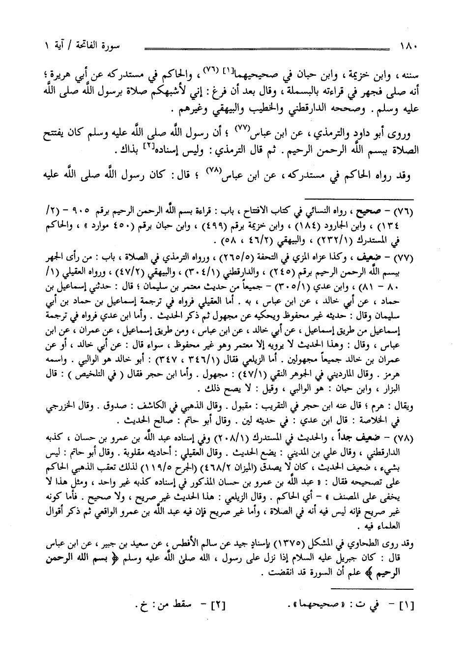 فِي سُنَنه وَابْن خُزَيْمَةَ وَابْن حِبَّان فِي صَحِيحَيْهِمَا وَالْحَاكِم فِي مُسْتَدْرَكه عَنْ أَبِي هُرَيْرَة أَنَّهُ صَلَّى فَجَهَرَ فِي قِرَاءَته بِالْبَسْمَلَةِ وَقَالَ بَعْد أَنْ فَرَغَ إِنِّي لَأَشْبَهكُمْ صَلَاة بِرَسُولِ اللَّه صَلَّى اللَّه عَلَيْهِ وَسَلَّمَ وَصَحَّحَهُ الدَّارَقُطْنِيّ وَالْخَطِيب وَالْبَيْهَقِيّ وَغَيْرهمْ وَرَوَى أَبُو دَاوُدَ وَالتِّرْمِذِيّ عَنْ اِبْن عَبَّاس أَنَّ رَسُول اللَّه صَلَّى اللَّه عَلَيْهِ وَسَلَّمَ كَانَ يَفْتَح الصَّلَاة بِبِسْمِ اللَّه الرَّحْمَن الرَّحِيم ثُمَّ قَالَ التِّرْمِذِيّ وَلَيْسَ إِسْنَاده بِذَاكَ وَقَدْ رَوَاهُ الْحَاكِم فِي مُسْتَدْرَكه عَنْ اِبْن عَبَّاس قَالَ : كَانَ رَسُول اللَّه صَلَّى اللَّه عَلَيْهِ