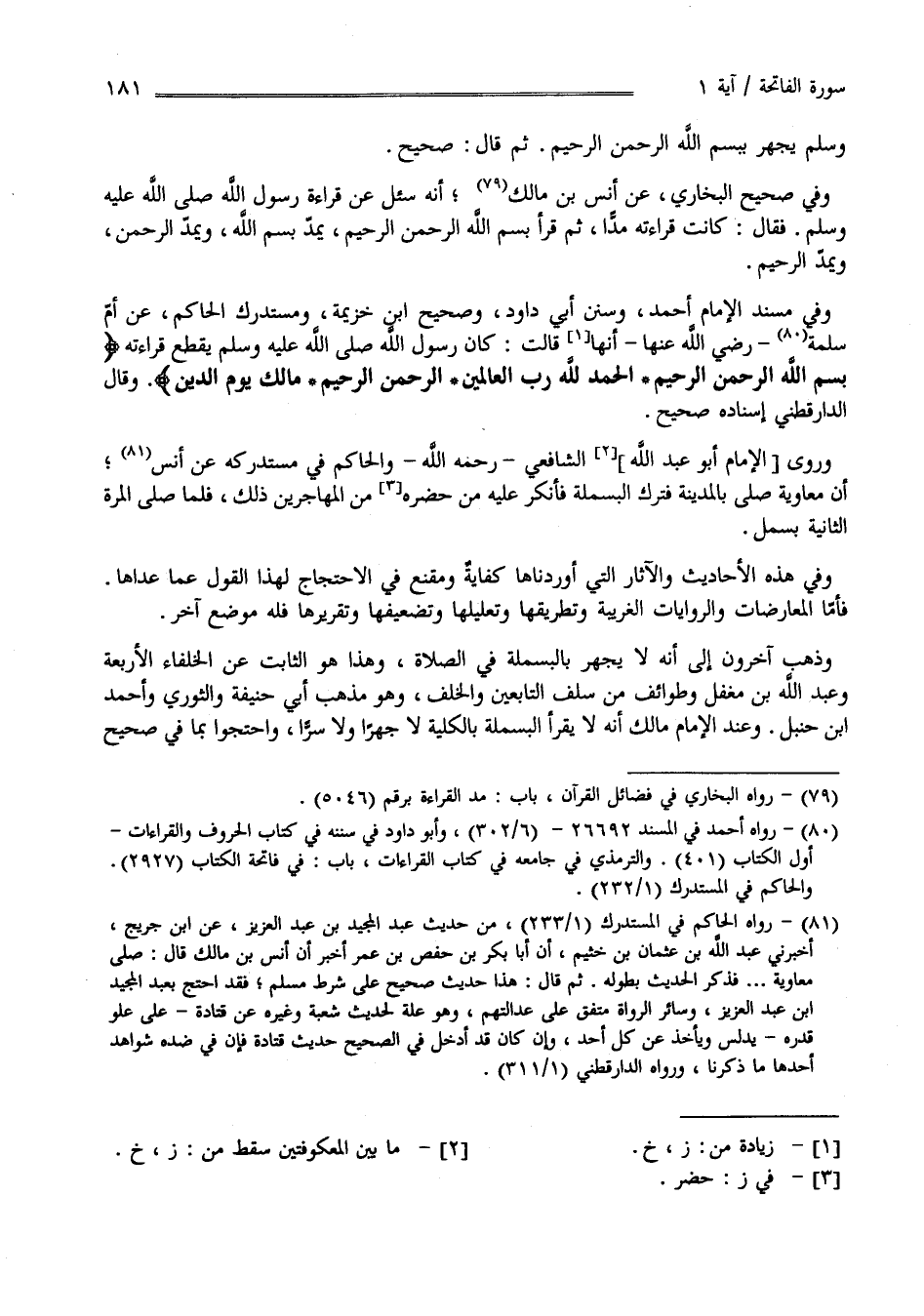 وَفِي مُسْنَد الْإِمَام أَحْمَد وَسُنَن أَبِي دَاوُدَ وَصَحِيح اِبْن خُزَيْمَةَ وَمُسْتَدْرَك الْحَاكِم عَنْ أُمّ سَلَمَة رَضِيَ اللَّه عَنْهَا قَالَتْ كَانَ رَسُول اللَّه صَلَّى اللَّه عَلَيْهِ وَسَلَّمَ يُقَطِّع قِرَاءَته" بِسْمِ اللَّه الرَّحْمَن الرَّحِيم الْحَمْد لِلَّهِ رَبّ الْعَالَمِينَ الرَّحْمَن الرَّحِيم مَالِك يَوْم الدِّين " وَقَالَ الدَّارَقُطْنِيّ إِسْنَادٌ صَحِيحٌ .