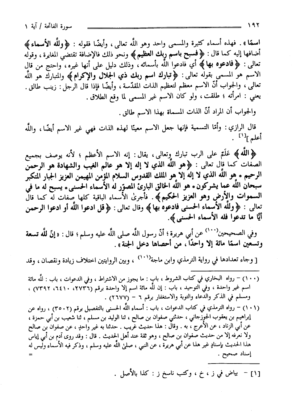 قَالَ الرَّازِيّ : وَأَمَّا التَّسْمِيَة فَإِنَّهَا جَعْل الِاسْم مُعَيِّنًا لِهَذِهِ الذَّات فَهِيَ غَيْر الِاسْم أَيْضًا وَاَللَّه أَعْلَم " اللَّه " عَلَم عَلَى الرَّبّ تَبَارَكَ وَتَعَالَى يُقَال إِنَّهُ الِاسْم الْأَعْظَم لِأَنَّهُ يُوصَف بِجَمِيعِ الصِّفَات كَمَا قَالَ تَعَالَى " هُوَ اللَّه الَّذِي لَا إِلَه إِلَّا هُوَ عَالِم الْغَيْب وَالشَّهَادَة هُوَ الرَّحْمَن الرَّحِيم هُوَ اللَّه الَّذِي لَا إِلَه إِلَّا هُوَ الْمَلِك الْقُدُّوس السَّلَام الْمُؤْمِن الْمُهَيْمِن الْعَزِيز الْجَبَّار الْمُتَكَبِّر سُبْحَان اللَّه عَمَّا يُشْرِكُونَ هُوَ اللَّه الْخَالِق الْبَارِئ الْمُصَوِّر لَهُ الْأَسْمَاء الْحُسْنَى يُسَبِّح لَهُ مَا فِي السَّمَوَات وَالْأَرْض وَهُوَ الْعَزِيز الْحَكِيم " فَأَجْرَى الْأَسْمَاء الْبَاقِيَةَ كُلّهَا صِفَات لَهُ كَمَا قَالَ تَعَالَى " وَلِلَّهِ الْأَسْمَاء الْحُسْنَى فَادْعُوهُ بِهَا " وَقَالَ تَعَالَى " قُلْ اُدْعُوا اللَّهَ أَوْ اُدْعُوا الرَّحْمَنَ أَيًّا مَا تَدْعُوا فَلَهُ الْأَسْمَاء الْحُسْنَى " وَفِي الصَّحِيحَيْنِ عَنْ أَبِي هُرَيْرَة أَنَّ رَسُولَ اللَّه صَلَّى اللَّه عَلَيْهِ وَسَلَّمَ قَالَ " إِنَّ لِلَّهِ تِسْعَة وَتِسْعِينَ اِسْمًا مِائَة إِلَّا وَاحِدًا مَنْ أَحْصَاهَا دَخَلَ الْجَنَّة " وَجَاءَ تَعْدَادهَا فِي رِوَايَة التِّرْمِذِيّ وَابْن مَاجَهْ وَبَيْن الرِّوَايَتَيْنِ اِخْتِلَاف زِيَادَة وَنُقْصَان وَقَدْ