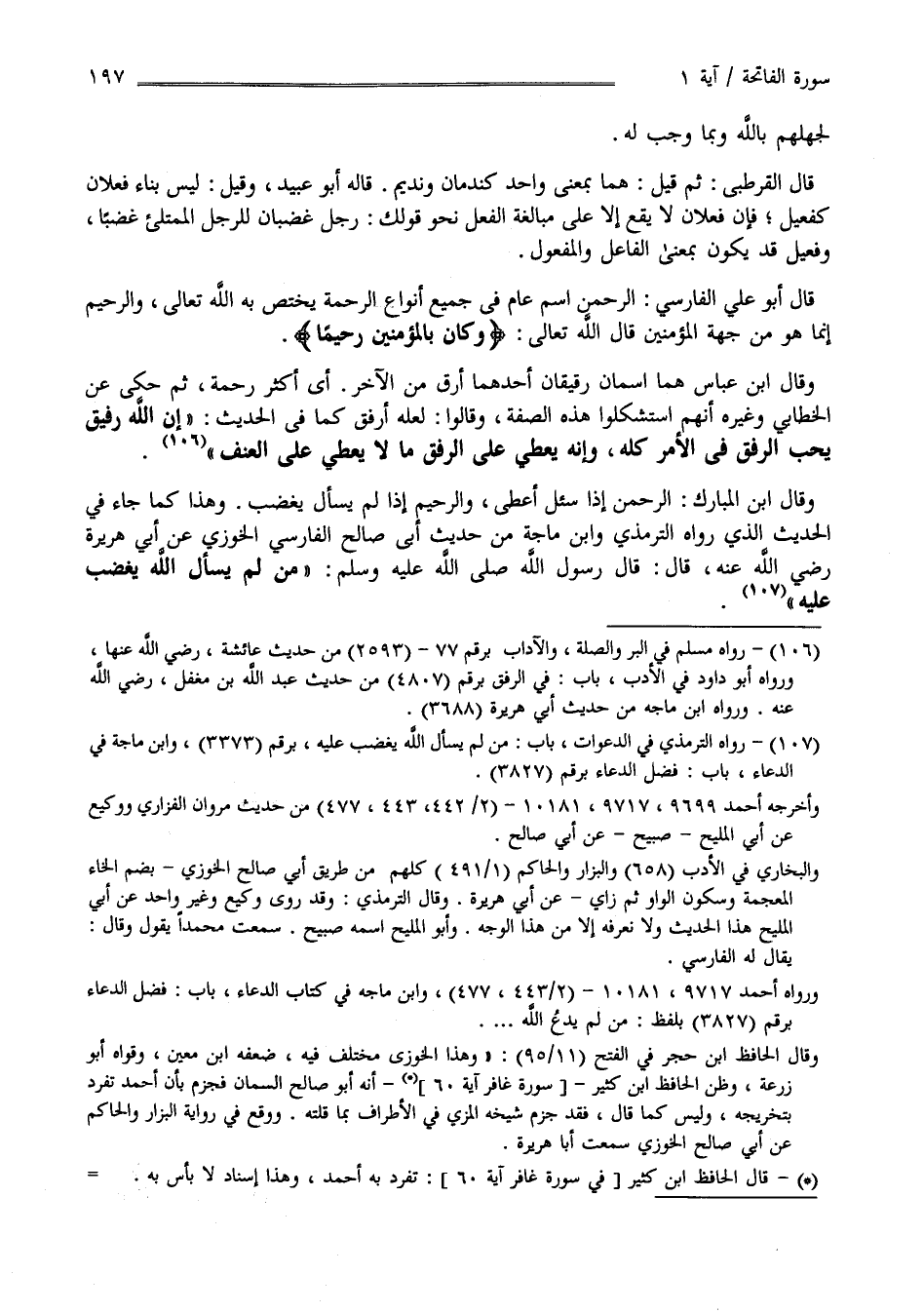 قَالَ اللَّه تَعَالَى " وَكَانَ بِالْمُؤْمِنِينَ رَحِيمًا " وَقَالَ اِبْن عَبَّاس هُمَا إِسْمَان رَقِيقَانِ أَحَدهمَا أَرَقّ مِنْ الْآخَر أَيْ أَكْثَر رَحْمَة ثُمَّ حُكِيَ عَنْ الْخَطَّابِيّ وَغَيْره أَنَّهُمْ اسْتَشْكَلُوا هَذِهِ الصِّفَة وَقَالُوا لَعَلَّهُ أَرْفَق كَمَا فِي الْحَدِيث " إِنَّ اللَّهَ رَفِيق يُحِبّ الرِّفْق فِي الْأَمْر كُلّه وَأَنَّهُ يُعْطِي عَلَى الرِّفْق مَا لَا يُعْطِي عَلَى الْعُنْف " وَقَالَ اِبْن الْمُبَارَك الرَّحْمَن إِذَا سُئِلَ أَعْطَى وَالرَّحِيم إِذَا لَمْ يُسْأَل يَغْضَب وَهَذَا كَمَا جَاءَ فِي الْحَدِيث الَّذِي رَوَاهُ التِّرْمِذِيّ وَابْن مَاجَهْ مِنْ حَدِيث أَبِي صَالِح الْفَارِسِيّ الْخَوْزِيّ عَنْ أَبِي هُرَيْرَة رَضِيَ اللَّه عَنْهُ قَالَ : قَالَ رَسُول اللَّه صَلَّى اللَّه عَلَيْهِ وَسَلَّمَ" مَنْ لَمْ يَسْأَل اللَّه يَغْضَب عَلَيْهِ "