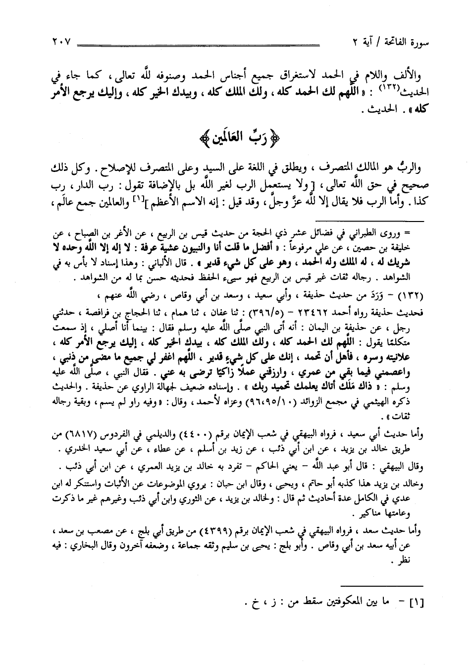 وَالْأَلِف وَاللَّام فِي الْحَمْد لِاسْتِغْرَاقِ جَمِيع أَجْنَاس الْحَمْد وَصُنُوفه لِلَّهِ تَعَالَى كَمَا جَاءَ فِي الْحَدِيث " اللَّهُمَّ لَك الْحَمْد كُلّه وَلَك الْمُلْك كُلّه وَبِيَدِك الْخَيْر كُلّه وَإِلَيْك يَرْجِع الْأَمْر كُلّه " الْحَدِيث .