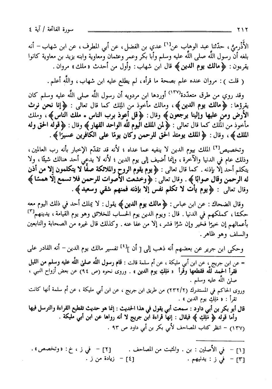 الْأَزْدِيّ حَدَّثَنَا عَبْد الْوَهَّاب بْن عَدِيّ بْن الْفَضْل عَنْ أَبِي الْمُطَرِّف عَنْ اِبْن شِهَاب أَنَّهُ بَلَغَهُ أَنَّ رَسُول اللَّه صَلَّى اللَّه عَلَيْهِ وَسَلَّمَ وَأَبَا بَكْر وَعُمَر وَعُثْمَان وَمُعَاوِيَة وَابْنه يَزِيد بْن مُعَاوِيَة كَانُوا يَقْرَءُونَ " مَالِك يَوْم الدِّين " قَالَ اِبْن شِهَاب وَأَوَّل مَنْ أَحْدَث " مَلِك " مَرْوَان " قُلْت " مَرْوَان عِنْدَهُ عِلْم بِصِحَّةِ مَا قَرَأَهُ لَمْ يَطَّلِع عَلَيْهِ اِبْن شِهَاب وَاَللَّه أَعْلَم .