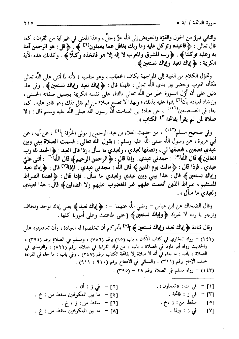 وَفِي صَحِيح مُسْلِم مِنْ حَدِيث الْعَلَاء بْن عَبْد الرَّحْمَن مَوْلَى الْحُرَقَة عَنْ أَبِيهِ عَنْ أَبِي هُرَيْره عَنْ رَ²?ول اللَّه صَلَّى اللَّه عَلَيْهِ وَسَلَّمَ" يَقُول اللَّه تَعَالَى قَسَمْت الصَّلَاةَ بَيْنِي وَبَيْنَ عَبْدِي نِصْفَيْنِ فَنِصْفهَا لِي وَنِصْفهَا لِعَبْدِي وَلِعَبْدِي مَا سَأَلَ إِذَا قَالَ الْعَبْد " الْحَمْد لِلَّهِ رَبّ الْعَالَمِينَ " قَالَ اللَّه حَمِدَنِي عَبْدِي وَإِذَا قَالَ " الرَّحْمَن الرَّحِيم " قَالَ اللَّه أَثْنَى عَلَيَّ عَبْدِي فَإِذَا قَالَ : " مَالِك يَوْم الدِّين" قَالَ اللَّه مَجَّدَنِي عَبْدِي وَإِذَا قَالَ " إِيَّاكَ نَعْبُد وَإِيَّاكَ نَسْتَعِين " قَالَ هَذَا بَيْنِي وَبَيْنَ عَبْدِي وَلِعَبْدِي مَا سَأَلَ فَإِذَا قَالَ " اِهْدِنَا الصِّرَاطَ الْمُسْتَقِيم صِرَاطَ الَّذِينَ أَنْعَمْت عَلَيْهِمْ غَيْر الْمَغْضُوب عَلَيْهِمْ وَلَا الضَّالِّينَ " قَالَ هَذَا لِعَبْدِي وَلِعَبْدِي مَا سَأَلَ " وَقَالَ الضَّحَّاك عَنْ اِبْن عَبَّاس رَضِيَ اللَّه عَنْهُمَا " إِيَّاكَ نَعْبُد" يَعْنِي إِيَّاكَ نُوَحِّد وَنَخَاف وَنَرْجُوك يَا رَبّنَا لَا غَيْرك" وَإِيَّاكَ نَسْتَعِين " عَلَى طَاعَتك وَعَلَى أُمُورنَا كُلّهَا وَقَالَ قَتَادَة " إِيَّاكَ نَعْبُد وَإِيَّاكَ نَسْتَعِين " يَأْمُركُمْ أَنْ تُخْلِصُوا لَهُ الْعِبَادَةَ وَأَنْ تَسْتَعِينُوهُ عَلَى