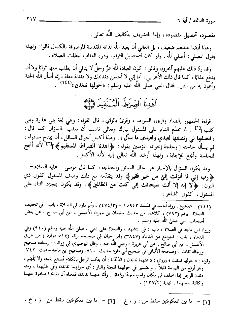 لَمَّا تَقَدَّمَ الثَّنَاء عَلَى الْمَسْئُول تَبَارَكَ وَتَعَالَى نَاسَبَ أَنْ يُعَقِّب بِالسُّؤَالِ كَمَا قَالَ" فَنِصْفهَا لِي وَنِصْفهَا لِعَبْدِي وَلِعَبْدِي مَا سَأَلَ " وَهَذَا أَكْمَل أَحْوَال السَّائِل أَنْ يَمْدَح مَسْئُوله ثُمَّ يَسْأَل حَاجَته وَحَاجَة إِخْوَانه الْمُؤْمِنِينَ بِقَوْلِهِ : " اِهْدِنَا الصِّرَاط الْمُسْتَقِيم " لِأَنَّهُ أَنْجَحَ لِلْحَاجَةِ وَأَنْجَع لِلْإِجَابَةِ وَلِهَذَا أَرْشَدَ اللَّه إِلَيْهِ لِأَنَّهُ الْأَكْمَل وَقَدْ يَكُون السُّؤَال بِالْإِخْبَارِ عَنْ حَال السَّائِل وَاحْتِيَاجه كَمَا قَالَ مُوسَى عَلَيْهِ السَّلَام " رَبّ إِنِّي لِمَا أَنْزَلْت إِلَيَّ مِنْ خَيْر فَقِير " وَقَدْ يَتَقَدَّمهُ مَعَ ذَلِكَ وَصْف مَسْئُول كَقَوْلِ ذِي النُّون " لَا إِلَه إِلَّا أَنْتَ سُبْحَانك إِنِّي كُنْت مِنْ الظَّالِمِينَ " وَقَدْ يَكُون بِمُجَرَّدِ الثَّنَاء عَلَى الْمَسْئُول كَقَوْلِ الشَّاعِر :