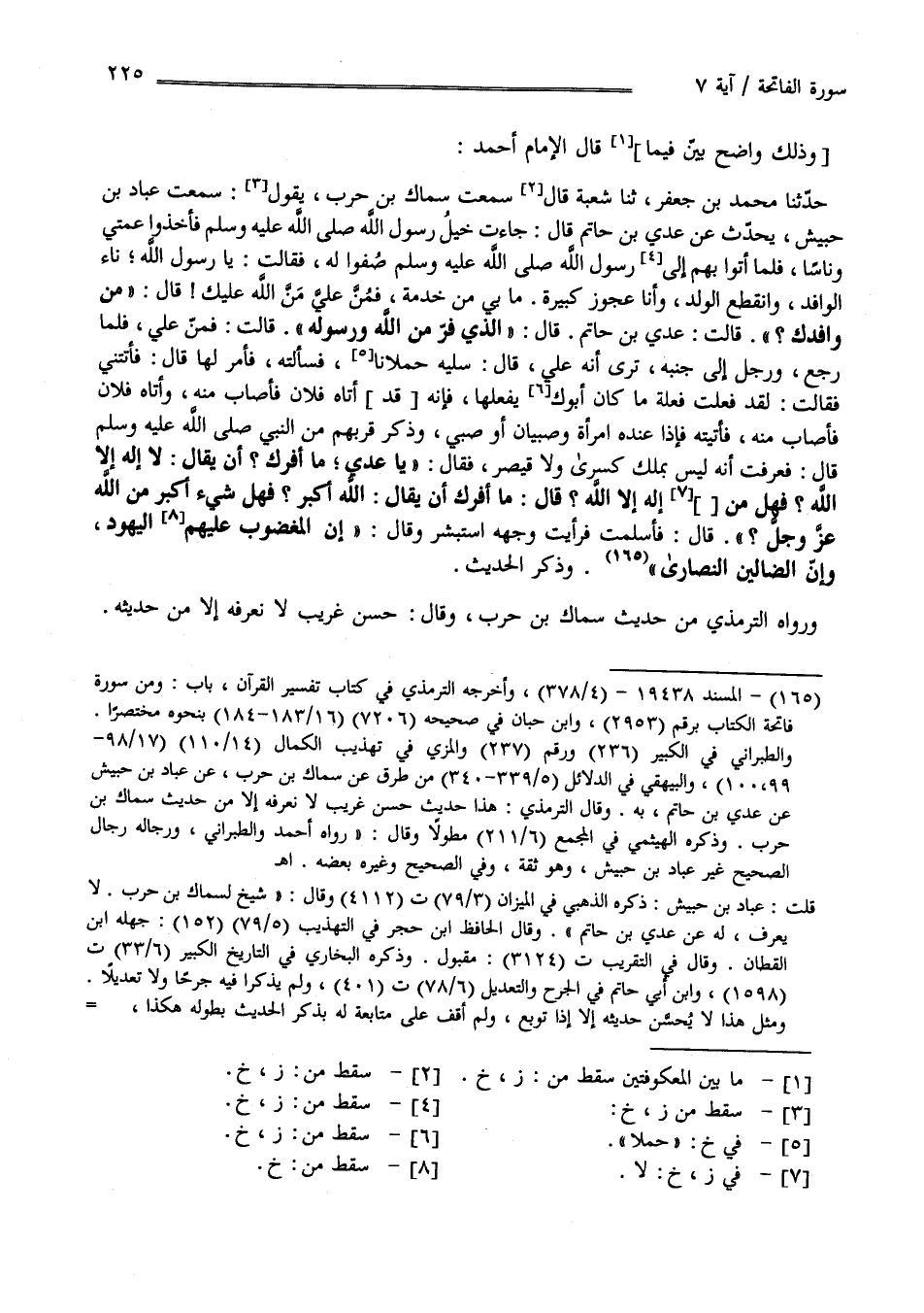 وَذَلِكَ وَاضِح بَيِّنٌ فِيمَا قَالَ الْإِمَام أَحْمَد حَدَّثَنَا مُحَمَّد بْن جَعْفَر ثَنَا شُعْبَة قَالَ سَمِعْت سِمَاك بْن حَرْب يَقُول سَمِعْت عَبَّاد بْن حُبَيْش يُحَدِّث عَنْ عَدِيّ بْن حَاتِم قَالَ جَاءَتْ خَيْل رَسُول اللَّه صَلَّى اللَّه عَلَيْهِ وَسَلَّمَ فَأَخَذُوا عَمَّتِي وَنَاسًا فَلَمَّا أَتَوْا بِهِمْ إِلَى رَسُول اللَّه صَلَّى اللَّه عَلَيْهِ وَسَلَّمَ صَفُّوا لَهُ فَقَالَتْ يَا رَسُول اللَّه : نَأَى الْوَافِد وَانْقَطَعَ الْوَلَد وَأَنَا عَجُوز كَبِيرَة مَا بِي مِنْ خِدْمَة فَمُنَّ عَلَيَّ مَنَّ اللَّه عَلَيْك قَالَ " مَنْ وَافِدك ؟ " قَالَتْ عَدِيّ بْن حَاتِم قَالَ " الَّذِي فَرَّ مِنْ اللَّه وَرَسُوله " قَالَتْ فَمَنَّ عَلَيَّ فَلَمَّا رَجَعَ وَرَجُل إِلَى جَنْبه تَرَى أَنَّهُ عَلِيّ قَالَ سَلِيهِ حِمْلَانًا فَسَأَلَتْهُ فَأَمَرَ لَهَا قَالَ فَأَتَتْنِي فَقَالَتْ لَقَدْ فَعَلْت فَعْلَة مَا كَانَ أَبُوك يَفْعَلهَا فَإِنَّهُ أَتَاهُ فُلَان فَأَصَابَ مِنْهُ وَأَتَاهُ فُلَان فَأَصَابَ مِنْهُ فَأَتَيْته فَإِذَا عِنْده اِمْرَأَة وَصِبْيَان وَذَكَرَ قُرْبهمْ مِنْ النَّبِيّ صَلَّى اللَّه عَلَيْهِ وَسَلَّمَ قَالَ فَعَرَفْت أَنَّهُ لَيْسَ بِمَلِكِ كِسْرَى وَلَا قَيْصَر فَقَالَ " يَا عَدِيّ مَا أَفَرَّك ؟ أَنْ يُقَال لَا إِلَه إِلَّا اللَّه ؟ فَهَلْ مِنْ إِلَه إِلَّا اللَّه مَا أَفَرَّك أَنْ يُقَال اللَّه أَكْبَر ؟ فَهَلْ شَيْء أَكْبَر مِنْ اللَّه عَزَّ وَجَلَّ " ؟ قَالَ فَأَسْلَمْت فَرَأَيْت وَجْهه اِسْتَبْشَرَ وَقَالَ" إِنَّ الْمَغْضُوبَ عَلَيْهِمْ الْيَهُود وَإِنَّ الضَّالِّينَ النَّصَارَى" وَذَكَرَ الْحَدِيث وَرَوَاهُ التِّرْمِذِيّ مِنْ حَدِيث سِمَاك بْن حَرْب وَقَالَ حَسَن غَرِيب لَا نَعْرِفهُ إِلَّا مِنْ حَدِيثه .