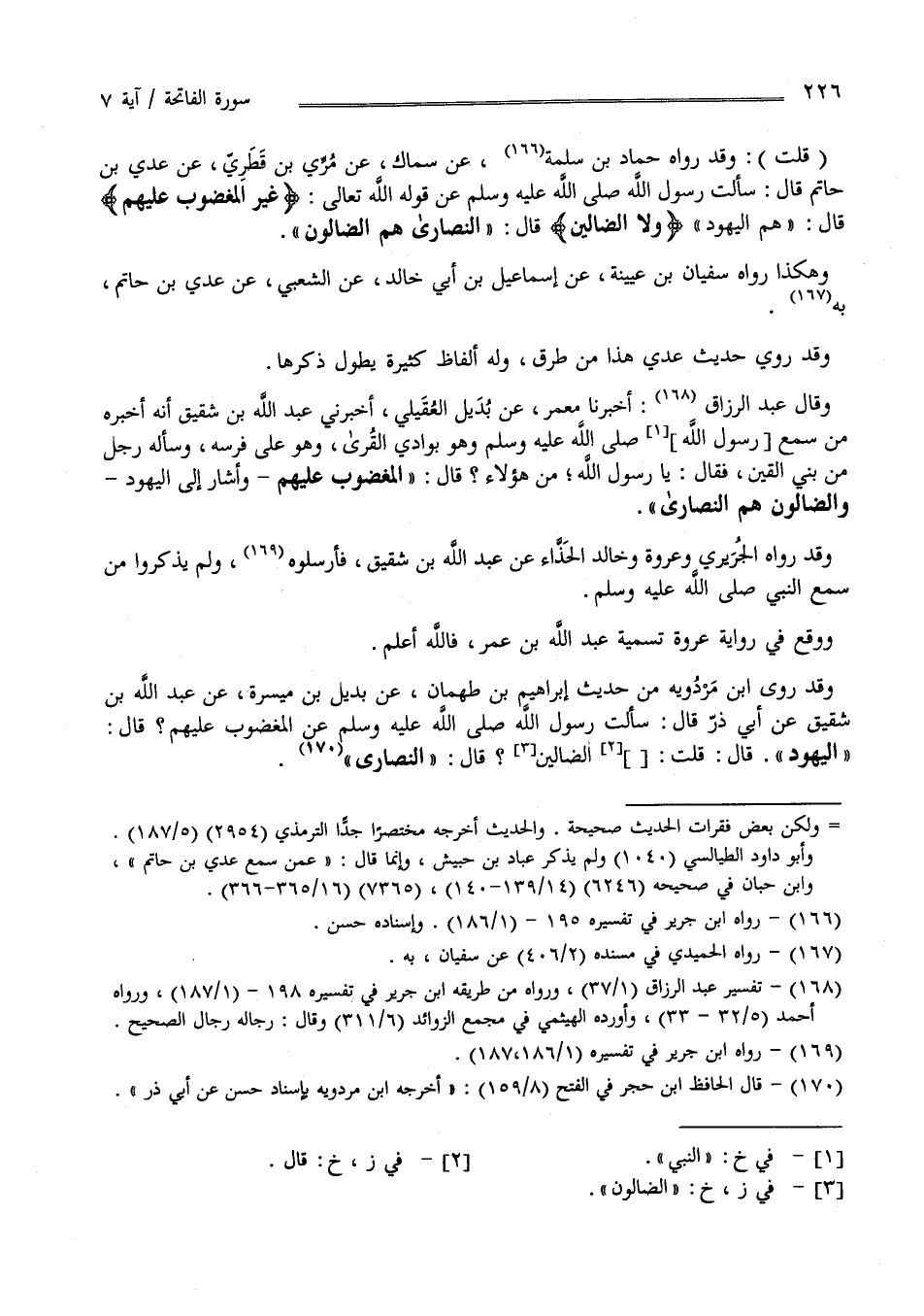 " قُلْت" وَقَدْ رَوَاهُ حَمَّاد بْن سَلَمَة عَنْ سِمَاك عَنْ مُرِّيّ بْن قَطَرِيّ عَنْ عَدِيّ بْن حَاتِم قَالَ : سَأَلْت رَسُولَ اللَّه صَلَّى اللَّه عَلَيْهِ وَسَلَّمَ عَنْ قَوْله تَعَالَى " غَيْر الْمَغْضُوب عَلَيْهِمْ " قَالَ " هُمْ الْيَهُود " " وَلَا الضَّالِّينَ " قَالَ : " النَّصَارَى هُمْ الضَّالُّونَ " وَهَكَذَا رَوَاهُ سُفْيَان بْن عُيَيْنَةَ عَنْ إِسْمَاعِيل بْن أَبِي خَالِد عَنْ الشَّعْبِيّ عَنْ عَدِيّ بْن حَاتِم بِهِ وَقَدْ رُوِيَ حَدِيث عَدِيّ هَذَا مِنْ طُرُق وَلَهُ أَلْفَاظ كَثِيرَة يَطُول ذِكْرهَا وَقَالَ عَبْد الرَّزَّاق أَنَا مَعْمَر عَنْ بُدَيْل الْعُقَيْلِيّ أَخْبَرَنِي عَبْد اللَّه بْن شَقِيق أَنَّهُ أَخْبَرَهُ مَنْ سَمِعَ رَسُول اللَّه صَلَّى اللَّه عَلَيْهِ وَسَلَّمَ وَهُوَ بِوَادِي الْقُرَى عَلَى فَرَسه وَسَأَلَهُ رَجُل مِنْ بَنِي الْقَيْن فَقَالَ يَا رَسُولَ اللَّه مَنْ هَؤُلَاءِ قَالَ " الْمَغْضُوب عَلَيْهِمْ - وَأَشَارَ إِلَى الْيَهُود - وَالضَّالُّونَ هُمْ النَّصَارَى " وَقَدْ رَوَاهُ الْجَرِيرِيّ وَعُرْوَة وَخَالِد الْحَذَّاء عَنْ عَبْد اللَّه بْن شَقِيق فَأَرْسَلُوهُ وَلَمْ يَذْكُرُوا مَنْ سَمِعَ النَّبِيّ صَلَّى اللَّه عَلَيْهِ وَسَلَّمَ وَوَقَعَ فِي رِوَايَة عُرْوَة تَسْمِيَة عَبْد اللَّه بْن عَمْرو فَاَللَّه أَعْلَم وَقَدْ رَوَى اِبْن مَرْدَوَيْهِ مِنْ حَدِيث إِبْرَاهِيم بْن طَهْمَان عَنْ بُدَيْل بْن مَيْسَرَة عَنْ عَبْد اللَّه بْن شَقِيق عَنْ أَبِي ذَرّ قَالَ سَأَلْت رَسُول اللَّه صَلَّى اللَّه عَلَيْهِ وَسَلَّمَ عَنْ الْمَغْضُوب عَلَيْهِمْ قَالَ " الْيَهُود " قُلْت الضَّالِّينَ قَالَ " النَّصَارَى "