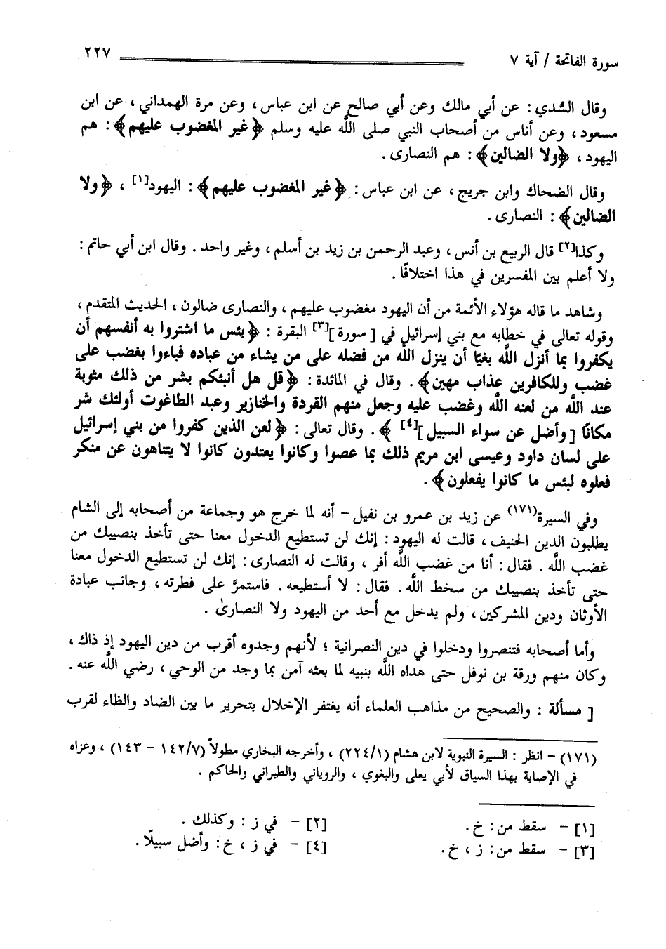 وَقَالَ السُّدِّيّ عَنْ أَبِي مَالِك وَعَنْ أَبِي صَالِح عَنْ اِبْن عَبَّاس وَعَنْ مُرَّة الْهَمْدَانِيّ عَنْ اِبْن مَسْعُود وَعَنْ أُنَاس مِنْ أَصْحَاب النَّبِيّ صَلَّى اللَّه عَلَيْهِ وَسَلَّمَ غَيْر الْمَغْضُوب عَلَيْهِمْ هُمْ الْيَهُود وَلَا الضَّالِّينَ هُمْ النَّصَارَى وَقَالَ الضَّحَّاك وَابْن جُرَيْج عَنْ اِبْن عَبَّاس " غَيْر الْمَغْضُوب عَلَيْهِمْ " الْيَهُود " وَلَا الضَّالِّينَ" النَّصَارَى وَكَذَا قَالَ الرَّبِيع بْن أَنَس وعَبْد الرَّحْمَن بْن زَيْد بْن أَسْلَم وَغَيْر وَاحِد وَقَالَ اِبْن أَبِي حَاتِم وَلَا أَعْلَم بَيْن الْمُفَسِّرِينَ فِي هَذَا اِخْتِلَافًا وَشَاهِد مَا قَالَهُ هَؤُلَاءِ الْأَئِمَّة مِنْ أَنَّ الْيَهُودَ مَغْضُوب عَلَيْهِمْ وَالنَّصَارَى ضَالُّونَ الْحَدِيث الْمُتَقَدِّم وَقَوْله تَعَالَى فِي خِطَابه مَعَ بَنِي إِسْرَائِيل فِي سُورَة الْبَقَرَة " بِئْسَ مَا اِشْتَرَوْا بِهِ أَنْفُسَهُمْ أَنْ يَكْفُرُوا بِمَا أَنْزَلَ اللَّه بَغْيًا أَنْ يُنَزِّل اللَّه مِنْ فَضْله عَلَى مَنْ يَشَاء مِنْ عِبَاده فَبَاءُوا بِغَضَبٍ عَلَى غَضَب وَلِلْكَافِرِينَ عَذَاب مُهِين " وَقَالَ فِي الْمَائِدَة " قُلْ هَلْ أُنَبِّئكُمْ بِشَرٍّ مِنْ ذَلِكَ مَثُوبَة عِنْد اللَّه مَنْ لَعَنَهُ اللَّه وَغَضِبَ عَلَيْهِ وَجَعَلَ مِنْهُمْ الْقِرَدَة وَالْخَنَازِير وَعَبَدَ الطَّاغُوت أُولَئِكَ شَرّ مَكَانًا وَأَضَلّ عَنْ سَوَاء السَّبِيل " وَقَالَ تَعَالَى " لُعِنَ الَّذِينَ كَفَرُوا مِنْ بَنِي إِسْرَائِيل عَلَى لِسَان دَاوُدَ وَعِيسَى اِبْن مَرْيَم ذَلِكَ بِمَا عَصَوْا وَكَانُوا يَعْتَدُونَ كَانُوا لَا يَتَنَاهَوْنَ عَنْ مُنْكَر فَعَلُوهُ لَبِئْسَ مَا كَانُوا يَفْعَلُونَ " وَفِي السِّيرَة عَنْ زَيْد بْن عَمْرو بْن