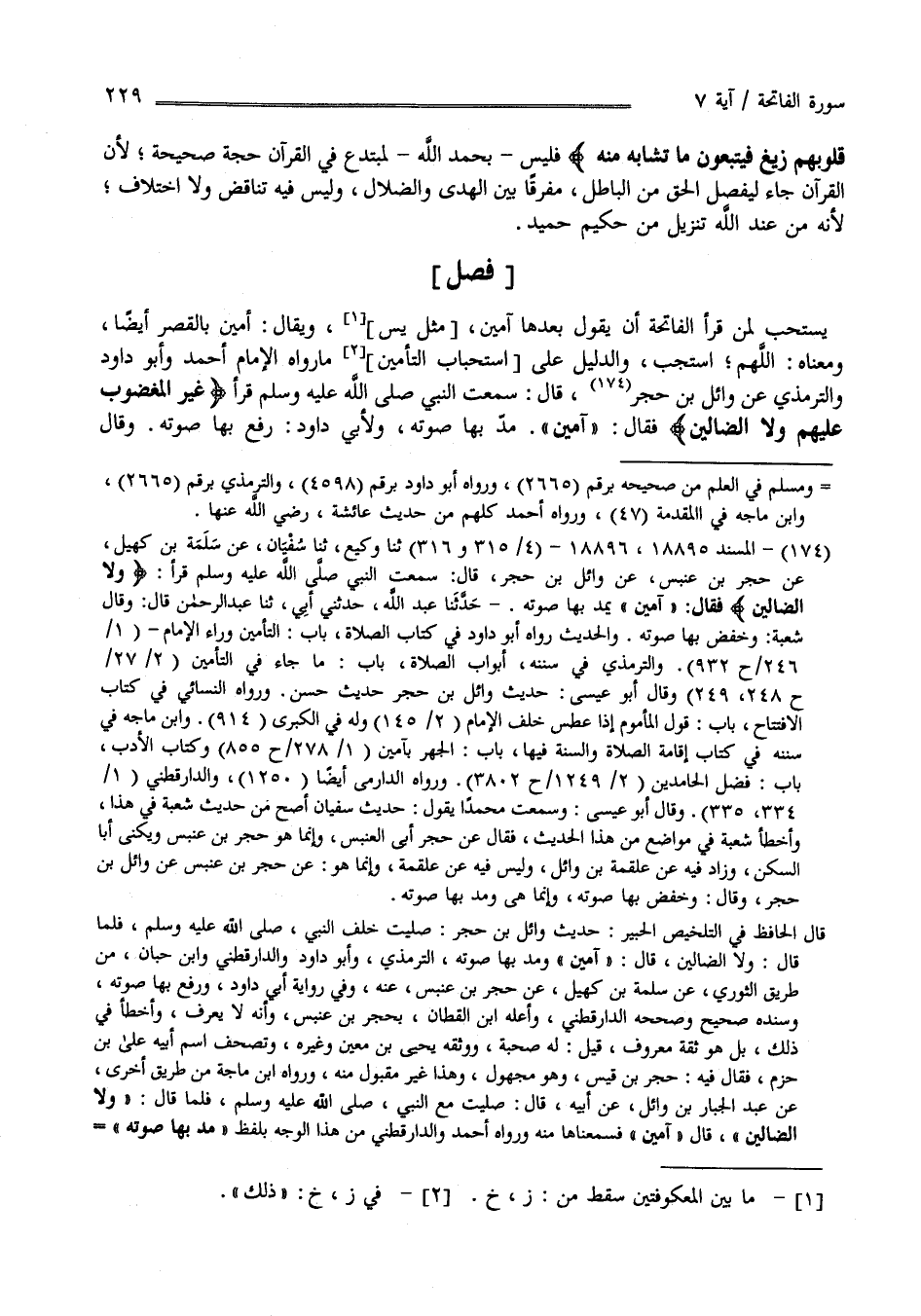 " فَصْل " يُسْتَحَبّ لِمَنْ يَقْرَأ الْفَاتِحَة أَنْ يَقُول بَعْدَهَا آمِينَ مِثْل يس وَيُقَال أَمِين بِالْقَصْرِ أَيْضًا وَمَعْنَاهُ اللَّهُمَّ اِسْتَجِبْ وَالدَّلِيل عَلَى اِسْتِحْبَاب التَّأْمِين مَا رَوَاهُ الْإِمَام أَحْمَد وَأَبُو دَاوُدَ وَالتِّرْمِذِيّ عَنْ وَائِل بْن حُجْر قَالَ : سَمِعْت النَّبِيّ صَلَّى اللَّه عَلَيْهِ وَسَلَّمَ قَرَأَ" غَيْر الْمَغْضُوب عَلَيْهِمْ وَلَا الضَّالِّينَ " فَقَالَ " آمِينَ" مَدّ بِهَا صَوْته وَلِأَبِي دَاوُدَ رَفَعَ بِهَا صَوْته وَقَالَ