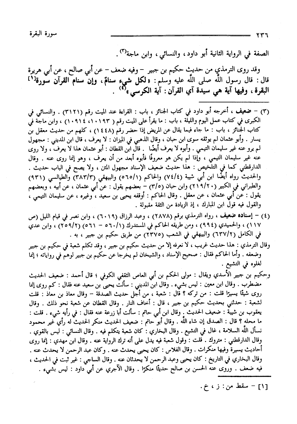 الصِّفَة فِي الرِّوَايَة الثَّانِيَة أَبُو دَاوُد وَالنَّسَائِيّ وَابْن مَاجَهْ وَقَدْ رَوَى التِّرْمِذِيُّ مِنْ حَدِيث حَكِيم بْن جُبَيْر وَفِيهِ ضَعْف عَنْ أَبِي صَالِح عَنْ أَبِي هُرَيْرَة قَالَ : قَالَ رَسُول اللَّه صَلَّى اللَّه عَلَيْهِ وَسَلَّمَ " لِكُلِّ شَيْء سَنَام وَإِنَّ سَنَام الْقُرْآن سُورَة الْبَقَرَة وَفِيهَا آيَة هِيَ سَيِّدَة آيِ الْقُرْآن آيَة الْكُرْسِيّ "