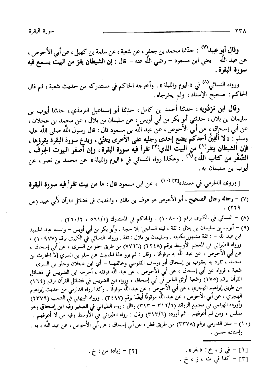 وَقَالَ أَبُو عُبَيْد حَدَّثَنَا مُحَمَّد بْن جَعْفَر عَنْ شُعْبَة عَنْ سَلَمَة بْن كُهَيْل عَنْ أَبِي الْأَحْوَص عَنْ عَبْد اللَّه يَعْنِي اِبْن مَسْعُود - رَضِيَ اللَّه عَنْهُ قَالَ إِنَّ الشَّيْطَان يَفِرّ مِنْ الْبَيْت الَّذِي يَسْمَع فِيهِ سُورَة الْبَقَرَة وَرَوَاهُ النَّسَائِيّ فِي الْيَوْم وَاللَّيْلَة وَأَخْرَجَهُ الْحَاكِم فِي مُسْتَدْرَكه مِنْ حَدِيث شُعْبَة ثُمَّ قَالَ الْحَاكِم : صَحِيح الْإِسْنَاد وَلَمْ يُخَرِّجَاهُ .