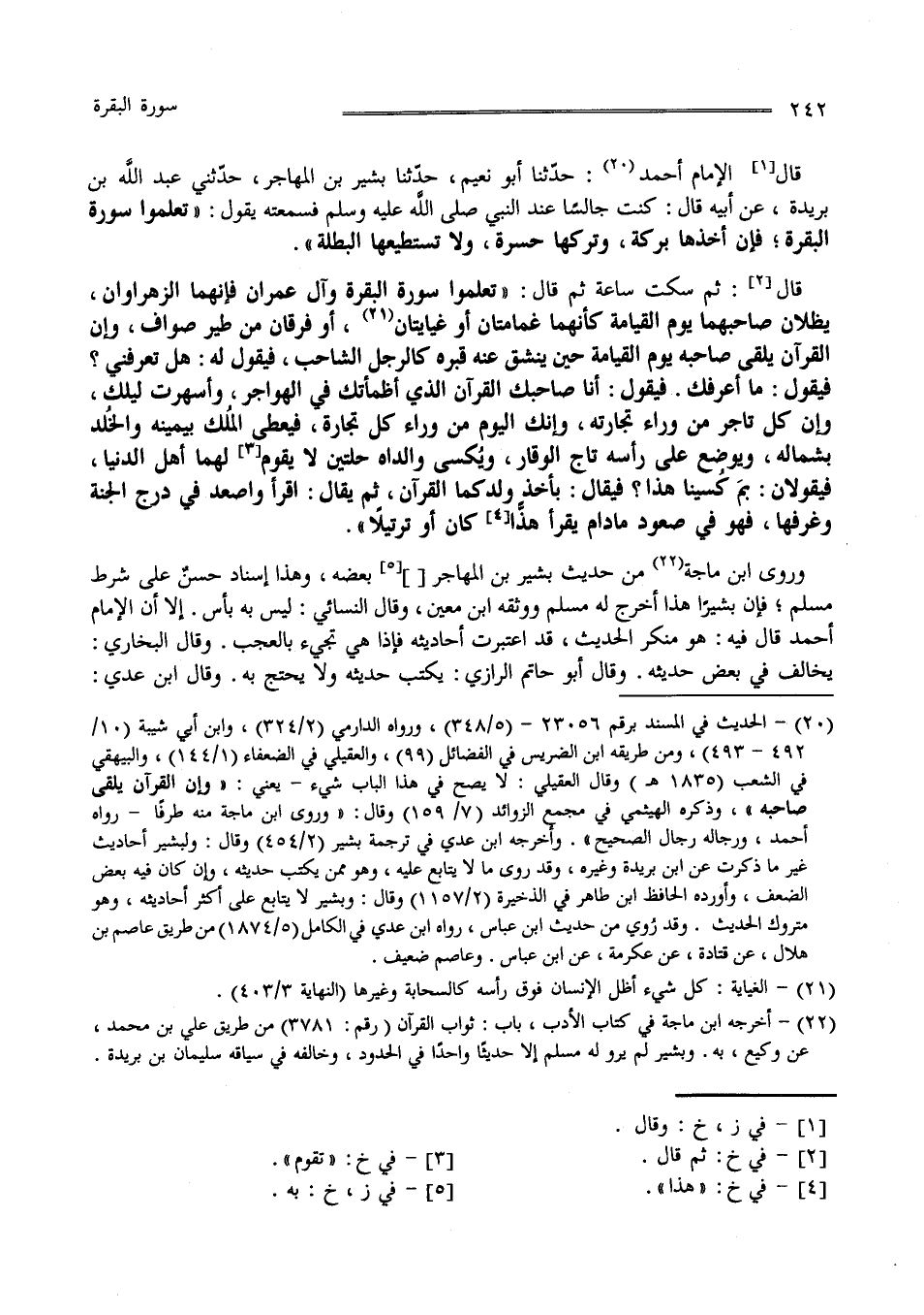 قَالَ الْإِمَام أَحْمَد حَدَّثَنَا أَبُو نُعَيْم حَدَّثَنَا بِشْر بْن مُهَاجِر حَدَّثَنِي عَبْد اللَّه بْن بُرَيْدَة عَنْ أَبِيهِ قَالَ : كُنْت جَالِسًا عِنْد النَّبِيّ صَلَّى اللَّه عَلَيْهِ وَسَلَّمَ فَسَمِعْته يَقُول" تَعَلَّمُوا سُورَة الْبَقَرَة فَإِنَّ أَخْذهَا بَرَكَة وَتَرْكهَا حَسْرَة وَلَا تَسْتَطِيعهَا الْبَطَلَة " قَالَ ثُمَّ سَكَتَ سَاعَة ثُمَّ قَالَ " تَعَلَّمُوا سُورَة الْبَقَرَة وَآل عِمْرَان فَإِنَّهُمَا الزَّهْرَاوَانِ يُظِلَّانِ صَاحِبهمَا يَوْم الْقِيَامَة كَأَنَّهُمَا غَمَامَتَانِ أَوْ غَيَايَتَانِ أَوْ فِرْقَانِ مِنْ طَيْر صَوَافّ وَإِنَّ الْقُرْآن يَلْقَى صَاحِبه يَوْم الْقِيَامَة حِين يَنْشَقّ عَنْهُ قَبْره كَالرَّجُلِ الشَّاحِب فَيَقُول لَهُ هَلْ تَعْرِفنِي ؟ فَيَقُول : مَا أَعْرِفك فَيَقُول أَنَا صَاحِبك الْقُرْآن الَّذِي أَظْمَأْتُك فِي الْهَوَاجِر وَأَسْهَرْت لَيْلك وَإِنَّ كُلّ تَاجِر مِنْ وَرَاء تِجَارَته وَإِنَّك الْيَوْم مِنْ وَرَاء كُلّ تِجَارَة فَيُعْطَى الْمُلْك بِيَمِينِهِ وَالْخُلْد بِشِمَالِهِ وَيُوضَع عَلَى رَأْسه تَاج الْوَقَار وَيُكْسَى وَالِدَاهُ حُلَّتَانِ لَا يُقَوَّم لَهُمَا أَهْل الدُّنْيَا فَيَقُولَانِ بِمَا كُسِينَا هَذَا فَيُقَال بِأَخْذِ وَلَدِكُمَا الْقُرْآن ثُمَّ يُقَال اِقْرَأْ وَاصْعَدْ فِي دَرَج الْجَنَّة وَغُرَفهَا فَهُوَ فِي صُعُود مَا دَامَ يَقْرَأ هَذًّا كَانَ أَوْ تَرْتِيلًا " وَرَوَى اِبْن مَاجَهْ مِنْ حَدِيث بِشْر بْن الْمُهَاجِر بَعْضه وَهَذَا إِسْنَاد حَسَن عَلَى شَرْط مُسْلِم فَإِنَّ بِشْرًا هَذَا خَرَّجَ لَهُ مُسْلِم وَوَثَّقَهُ اِبْن مَعِين وَقَالَ النَّسَائِيّ مَا بِهِ بَأْس إِلَّا أَنَّ الْإِمَام أَحْمَد قَالَ فِيهِ هُوَ مُنْكَر الْحَدِيث قَدْ اِعْتَبَرْت أَحَادِيثه فَإِذَا هِيَ تَأْتِي بِالْعَجَبِ وَقَالَ الْبُخَارِيّ يُخَالِف فِي بَعْض حَدِيثه وَقَالَ أَبُو حَاتِم الرَّازِيّ يُكْتَب حَدِيثه وَلَا يُحْتَجّ بِهِ وَقَالَ اِبْن عَدِيّ