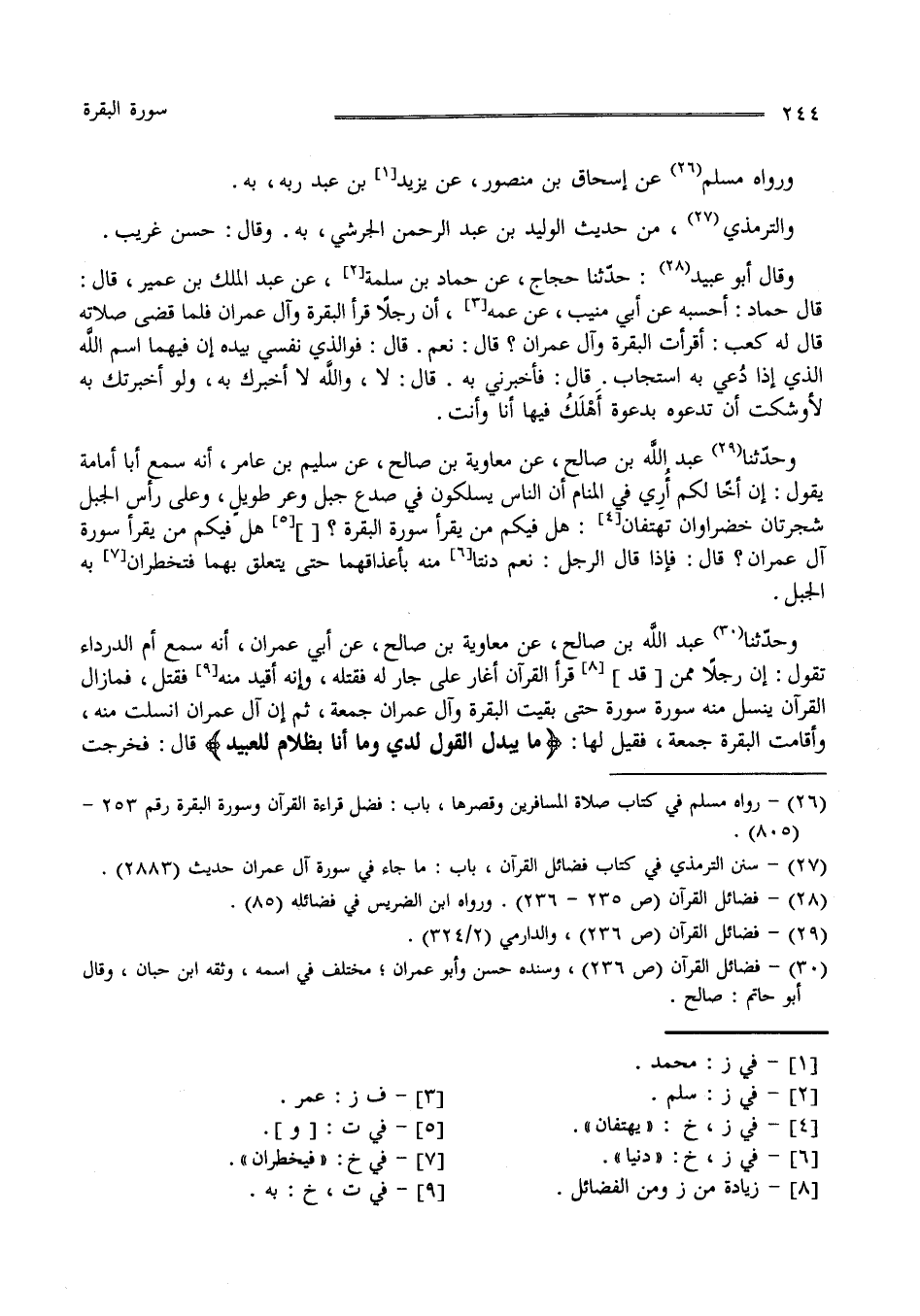 قَالَ فَأَخْبِرْنِي بِهِ قَالَ لَا وَاَللَّه لَا أُخْبِرك بِهِ وَلَوْ أَخْبَرْتُك بِهِ لَأَوْشَكْت أَنْ تَدْعُوهُ بِدَعْوَةٍ أَهْلِك فِيهَا أَنَا وَأَنْتَ وَحَدَّثَنَا عَبْد اللَّه بْن صَالِح عَنْ مُعَاوِيَة بْن صَالِح عَنْ سُلَيْم بْن عَامِر أَنَّهُ سَمِعَ أَبَا أُمَامَة يَقُول إِنَّ أَخًا لَكُمْ أُرِيَ فِي الْمَنَام أَنَّ النَّاس يَسْلُكُونَ فِي صَدْع جَبَل وَعْر طَوِيل وَعَلَى رَأْس الْجَبَل شَجَرَتَانِ خَضْرَاوَانِ تَهْتِفَانِ هَلْ فِيكُمْ قَارِئ يَقْرَأ سُورَة الْبَقَرَة ؟ وَهَلْ فِيكُمْ قَارِئ يَقْرَأ سُورَة آل عِمْرَان ؟ قَالَ فَإِذَا قَالَ الرَّجُل نَعَمْ دَنَتَا مِنْهُ بِأَعْذَاقِهِمَا حَتَّى يَتَعَلَّق بِهِمَا فَتَخْطِرَانِ بِهِ الْجَبَل : وَحَدَّثَنَا عَبْد اللَّه بْن صَالِح عَنْ مُعَاوِيَة بْن صَالِح عَنْ أَبِي عِمْرَان أَنَّهُ سَمِعَ أُمّ الدَّرْدَاء تَقُول إِنَّ رَجُلًا مِمَّنْ قَرَأَ الْقُرْآن أَغَارَ عَلَى جَارٍ لَهُ فَقَتَلَهُ وَإِنَّهُ أُقِيدَ بِهِ فَقُتِلَ فَمَا زَالَ الْقُرْآن يَنْسَلّ مِنْهُ سُورَة سُورَة حَتَّى بَقِيَتْ الْبَقَرَة وَآل عِمْرَان جُمْعَة ثُمَّ إِنَّ آل عِمْرَان اِنْسَلَّتْ مِنْهُ وَأَقَامَتْ الْبَقَرَة جُمْعَة فَقِيلَ لَهَا " مَا يُبَدَّلُ الْقَوْلُ لَدَيَّ وَمَا أَنَا بِظَلَّامٍ لِلْعَبِيدِ " قَالَ فَخَرَجَتْ