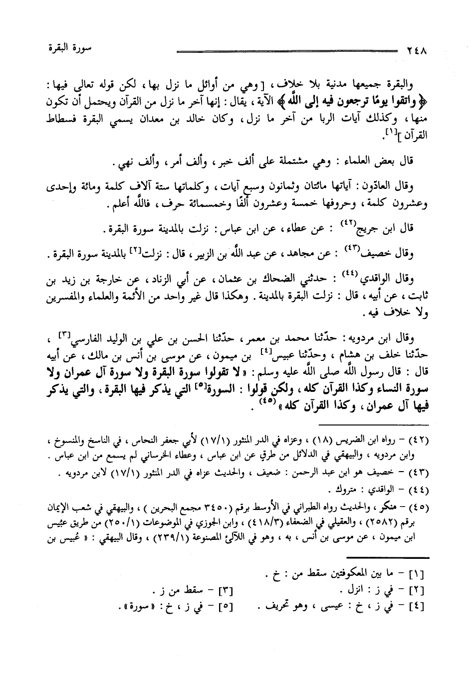 وَالْبَقَرَة جَمِيعهَا مَدَنِيَّة بِلَا خِلَاف وَهِيَ مِنْ أَوَائِل مَا نَزَلَ بِهَا لَكِنَّ قَوْله تَعَالَى فِيهِ" وَاتَّقُوا يَوْمًا تُرْجَعُونَ فِيهِ إِلَى اللَّه " الْآيَة يُقَال إِنَّهَا آخِر مَا نَزَلَ مِنْ الْقُرْآن وَيَحْتَمِل أَنْ تَكُون مِنْهَا وَكَذَلِكَ آيَات الرِّبَا مِنْ آخِر مَا نَزَلَ وَكَانَ خَالِد بْن مَعْدَان يُسَمِّي الْبَقَرَة فُسْطَاط الْقُرْآن قَالَ بَعْض الْعُلَمَاء وَهِيَ مُشْتَمِلَة عَلَى أَلْف خَبَر وَأَلْف أَمْر وَأَلْف نَهْي وَقَالَ الْعَادُّونَ آيَاتهَا مِائَتَانِ وَثَمَانُونَ وَسَبْع آيَات وَكَلِمَاتهَا سِتَّة آلَاف كَلِمَة وَمِائَتَانِ وَإِحْدَى وَعِشْرُونَ كَلِمَة وَحُرُوفهَا خَمْسَة وَعِشْرُونَ أَلْفًا وَخَمْسمِائَةِ حَرْف فَاَللَّه أَعْلَم.