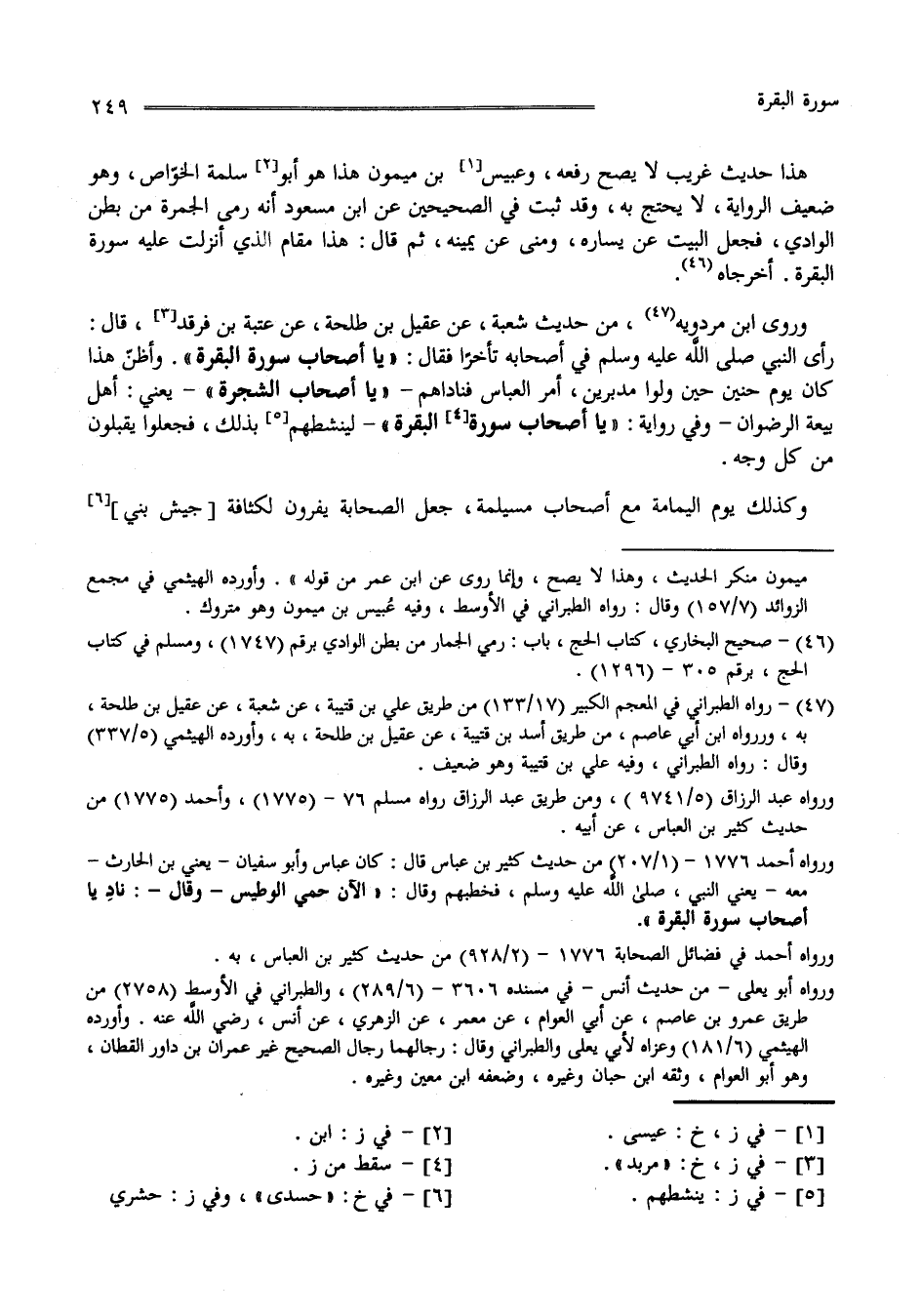هَذَا حَدِيث غَرِيب لَا يَصِحّ رَفْعُهُ وَعِيسَى بْن مَيْمُون هَذَا هُوَ أَبُو سَلَمَة الْخَوَاصّ وَهُوَ ضَعِيف الرِّوَايَة لَا يُحْتَجّ بِهِ وَقَدْ ثَبَتَ فِي الصَّحِيحَيْنِ عَنْ اِبْن مَسْعُود أَنَّهُ رَمَى الْجَمْرَة مِنْ بَطْن الْوَادِي فَجَعَلَ الْبَيْت عَنْ يَسَاره وَمِنًى عَنْ يَمِينه ثُمَّ قَالَ هَذَا مَقَام الَّذِي أُنْزِلَتْ عَلَيْهِ سُورَة الْبَقَرَة أَخْرَجَاهُ وَرَوَى اِبْن مَرْدَوَيْهِ مِنْ حَدِيث شُعْبَة عَنْ عُقَيْل بْن طَلْحَة عَنْ عُتْبَة بْن مَرْثَد قَالَ : رَأَى النَّبِيّ صَلَّى اللَّه عَلَيْهِ وَسَلَّمَ فِي أَصْحَابه تَأَخُّرًا فَقَالَ " يَا أَصْحَاب سُورَة الْبَقَرَة " وَأَظُنّ هَذَا كَانَ يَوْم حُنَيْن يَوْم وَلَّوْا مُدْبِرِينَ أَمَرَ الْعَبَّاس فَنَادَاهُمْ" يَا أَصْحَاب الشَّجَرَة " يَعْنِي أَهْل بَيْعَة الرِّضْوَان وَفِي رِوَايَة " يَا أَصْحَاب سُورَة الْبَقَرَة " لِيُنَشِّطهُمْ بِذَلِكَ فَجَعَلُوا يُقْبِلُونَ مِنْ كُلّ وَجْه وَكَذَلِكَ يَوْم الْيَمَامَة مَعَ أَصْحَاب مُسَيْلِمَة جَعَلَ الصَّحَابَة يَفِرُّونَ لِكَثَافَةِ جَيْش بَنِي