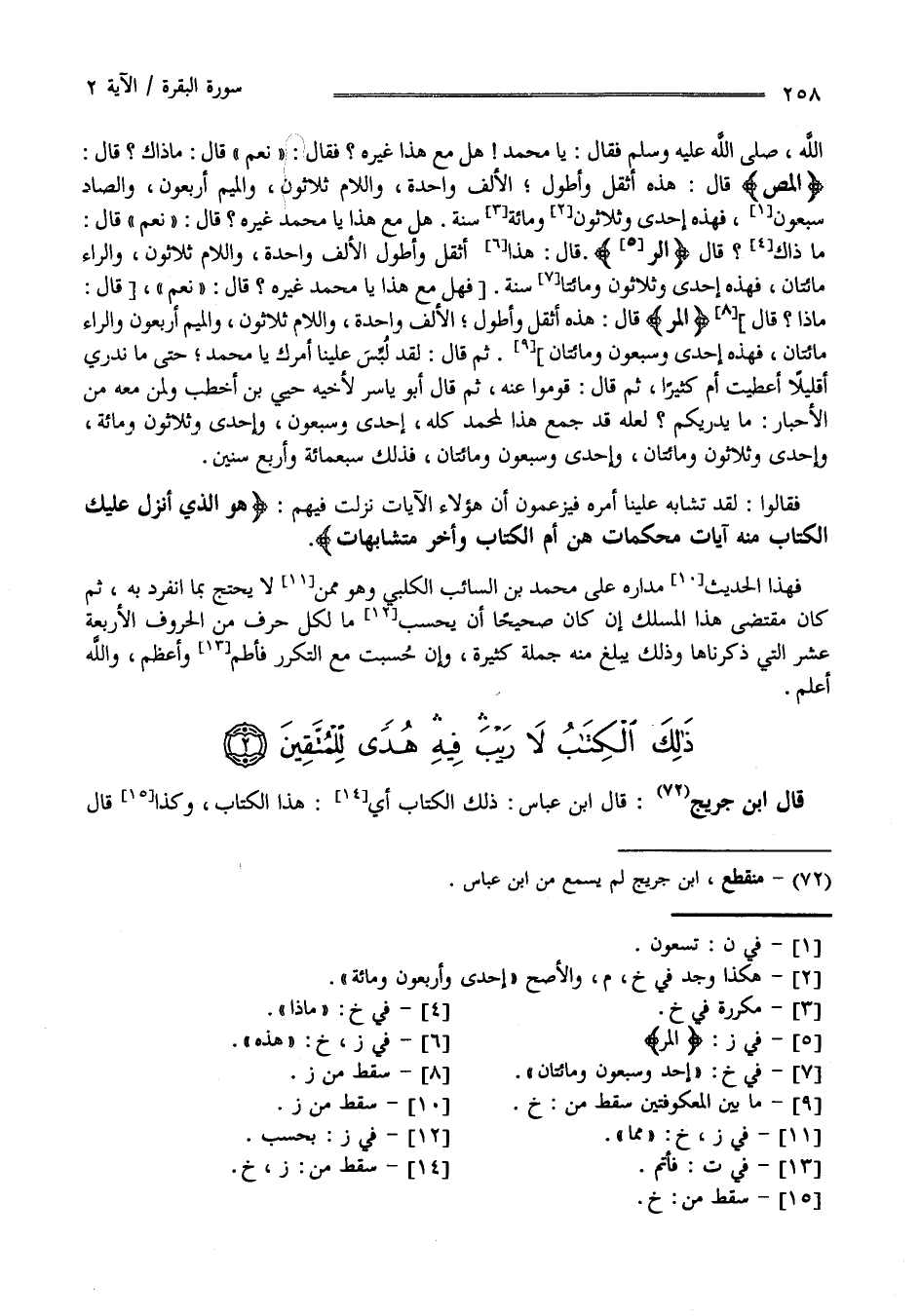 ثُمَّ قَالَ قُومُوا عَنْهُ ثُمَّ قَالَ أَبُو يَاسِر لِأَخِيهِ حُيَيّ بْن أَخْطَب وَلِمَنْ مَعَهُ مِنْ الْأَحْبَار مَا يُدْرِيكُمْ لَعَلَّهُ قَدْ جَمَعَ هَذَا لِمُحَمَّدٍ كُلّه إِحْدَى وَسَبْعُونَ وَإِحْدَى وَثَلَاثُونَ وَمِائَة وَإِحْدَى وَثَلَاثُونَ وَمِائَتَانِ وَإِحْدَى وَسَبْعُونَ وَمِائَتَانِ فَذَلِكَ سَبْعمِائَةِ وَأَرْبَع سِنِينَ ؟ فَقَالُوا لَقَدْ تَشَابَهَ عَلَيْنَا أَمْره فَيَزْعُمُونَ أَنَّ هَؤُلَاءِ الْآيَات نَزَلَتْ فِيهِمْ " هُوَ الَّذِي أَنْزَلَ عَلَيْك الْكِتَاب مِنْهُ آيَات مُحْكَمَات هُنَّ أُمّ الْكِتَاب وَأُخَر مُتَشَابِهَات" فَهَذَا الْحَدِيث مَدَاره عَلَى مُحَمَّد بْن السَّائِب الْكَلْبِيّ وَهُوَ مِمَّنْ لَا يُحْتَجّ بِمَا اِنْفَرَدَ بِهِ ثُمَّ كَانَ مُقْتَضَى هَذَا الْمَسْلَك إِنْ كَانَ صَحِيحًا أَنْ يَحْسِب مَا لِكُلِّ حَرْف مِنْ الْحُرُوف الْأَرْبَعَة عَشَر الَّتِي ذَكَرْنَاهَا وَذَلِكَ يَبْلُغ مِنْهُ جُمْلَة كَثِيرَة وَإِنْ حُسِبَتْ مَعَ التَّكَرُّر فَأَطَمّ وَأَعْظَم وَاَللَّه أَعْلَم .