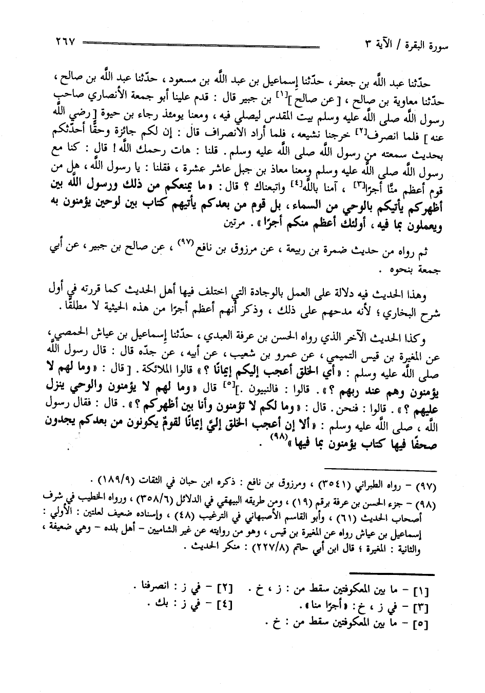 وَهَذَا الْحَدِيث فِيهِ دَلَالَة عَلَى الْعَمَل بِالْوِجَادَةِ الَّتِي اِخْتَلَفَ فِيهَا أَهْل الْحَدِيث كَمَا قَرَّرْته فِي أَوَّل شَرْح الْبُخَارِيّ لِأَنَّهُ مَدَحَهُمْ عَلَى ذَلِكَ وَذَكَرَ أَنَّهُمْ أَعْظَم أَجْرًا مِنْ هَذِهِ الْحَيْثِيَّة لَا مُطْلَقًا وَكَذَا الْحَدِيث الْآخَر الَّذِي رَوَاهُ الْحَسَن بْن عَرَفَة الْعَبْدِيّ حَدَّثَنَا إِسْمَاعِيل بْن عَيَّاش الْحِمْصِيّ عَنْ الْمُغِيرَة بْن قَيْس التَّمِيمِيّ عَنْ عَمْرو بْن شُعَيْب عَنْ أَبِيهِ عَنْ جَدّه قَالَ : قَالَ رَسُول اللَّه صَلَّى اللَّه عَلَيْهِ وَسَلَّمَ " أَيّ الْخَلْق أَعْجَب إِلَيْكُمْ إِيمَانًا ؟ قَالُوا الْمَلَائِكَة قَالَ " وَمَا لَهُمْ لَا يُؤْمِنُونَ وَهُمْ عِنْد رَبّهمْ " قَالُوا فَالنَّبِيُّونَ قَالَ " وَمَا لَهُمْ لَا يُؤْمِنُونَ وَالْوَحْي يَنْزِل عَلَيْهِمْ ؟ " قَالُوا فَنَحْنُ قَالَ " وَمَا لَكُمْ لَا تُؤْمِنُونَ وَأَنَا بَيْن أَظْهُركُمْ " قَالَ : فَقَالَ رَسُول اللَّه صَلَّى اللَّه عَلَيْهِ وَسَلَّمَ " أَلَا إِنَّ أَعْجَب الْخَلْق إِلَيَّ إِيمَانًا لَقَوْم يَكُونُونَ مِنْ بَعْدكُمْ يَجِدُونَ صُحُفًا فِيهَا كِتَاب يُؤْمِنُونَ بِمَا فِيهَا "