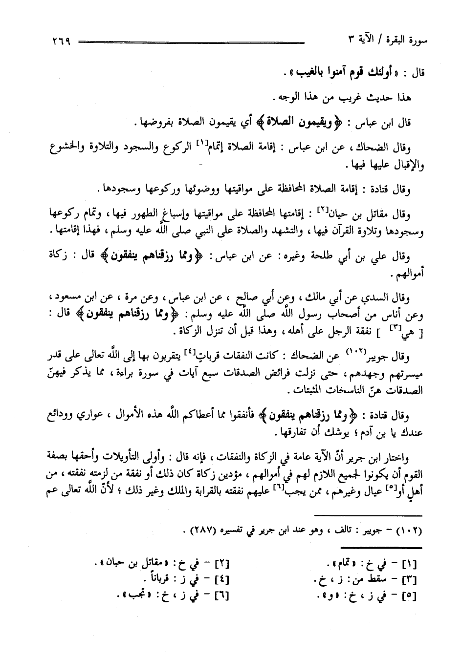 وَقَالَ عَلِيّ بْن أَبِي طَلْحَة وَغَيْره عَنْ اِبْن عَبَّاس " وَمِمَّا رَزَقْنَاهُمْ يُنْفِقُونَ " قَالَ زَكَاة أَمْوَالهمْ وَقَالَ السُّدِّيّ عَنْ أَبِي مَالِك وَعَنْ أَبِي صَالِح عَنْ اِبْن عَبَّاس وَعَنْ مُرَّة عَنْ اِبْن مَسْعُود وَعَنْ أُنَاس مِنْ أَصْحَاب رَسُول اللَّه صَلَّى اللَّه عَلَيْهِ وَسَلَّمَ " وَمِمَّا رَزَقْنَاهُمْ يُنْفِقُونَ " قَالَ نَفَقَة الرَّجُل عَلَى أَهْله وَهَذَا قَبْل أَنْ تَنْزِل الزَّكَاة وَقَالَ جُوَيْبِر عَنْ الضَّحَّاك : كَانَتْ النَّفَقَات قُرْبَانًا يَتَقَرَّبُونَ بِهَا إِلَى اللَّه عَلَى قَدْر مَيْسَرَتهمْ وَجَهْدهمْ حَتَّى نَزَلَتْ فَرَائِض الصَّدَقَات سَبْع آيَات فِي سُورَة بَرَاءَة مِمَّا يُذْكَر فِيهِنَّ الصَّدَقَات هُنَّ النَّاسِخَات الْمُثْبِتَات وَقَالَ قَتَادَة " وَمِمَّا رَزَقْنَاهُمْ يُنْفِقُونَ " فَأَنْفِقُوا مِمَّا أَعْطَاكُمْ اللَّه هَذِهِ الْأَمْوَال عَوَار وَوَدَائِع عِنْدك يَا اِبْن آدَم يُوشِك أَنْ تُفَارِقهَا .