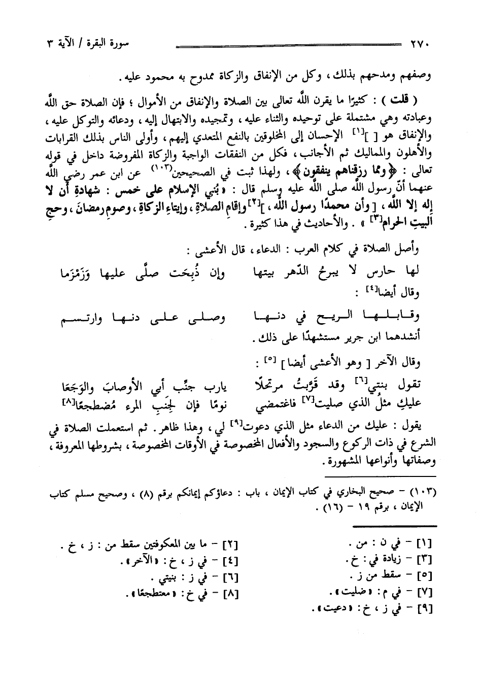 وَصْفهمْ وَمَدَحَهُمْ بِذَلِكَ وَكُلّ مِنْ الْإِنْفَاق وَالزَّكَاة مَمْدُوح بِهِ مَحْمُود عَلَيْهِ " قُلْت " كَثِيرًا مَا يَقْرُن اللَّهُ تَعَالَى بَيْن الصَّلَاة وَالْإِنْفَاق مِنْ الْأَمْوَال فَإِنَّ الصَّلَاة حَقّ اللَّه وَعِبَادَته وَهِيَ مُشْتَمِلَة عَلَى تَوْحِيده وَالثَّنَاء عَلَيْهِ وَتَمْجِيده وَالِابْتِهَال إِلَيْهِ وَدُعَائِهِ وَالتَّوَكُّل عَلَيْهِ وَالْإِنْفَاق هُوَ مِنْ الْإِحْسَان إِلَى الْمَخْلُوقِينَ بِالنَّفْعِ الْمُتَعَدِّي إِلَيْهِمْ وَأَوْلَى النَّاس بِذَلِكَ الْقَرَابَات وَالْأَهْلُونَ وَالْمَمَالِيك ثُمَّ الْأَجَانِب فَكُلّ مِنْ النَّفَقَات الْوَاجِبَة وَالزَّكَاة الْمَفْرُوضَة دَاخِل فِي قَوْله تَعَالَى " وَمِمَّا رَزَقْنَاهُمْ يُنْفِقُونَ " وَلِهَذَا ثَبَتَ فِي الصَّحِيحَيْنِ عَنْ اِبْن عُمَر رَضِيَ اللَّه عَنْهَا أَنَّ رَسُول اللَّه صَلَّى اللَّه عَلَيْهِ وَسَلَّمَ قَالَ " بُنِيَ الْإِسْلَامُ عَلَى خَمْس : شَهَادَة أَنْ لَا إِلَه إِلَّا اللَّه وَأَنَّ مُحَمَّدًا رَسُول اللَّه وَإِقَام الصَّلَاة وَإِيتَاء الزَّكَاة وَصَوْم رَمَضَان وَحَجّ الْبَيْت " وَالْأَحَادِيث فِي هَذَا كَثِيرَة وَأَصْلُ الصَّلَاة فِي كَلَام الْعَرَب الدُّعَاء .