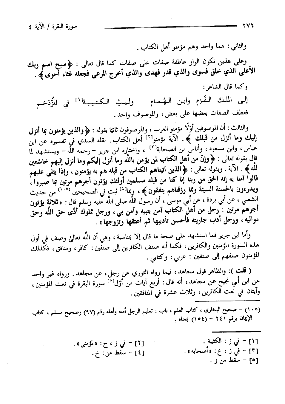 فَعَطَفَ الصِّفَات بَعْضهَا عَلَى بَعْض وَالْمَوْصُوف وَاحِد وَالثَّالِث أَنَّ الْمَوْصُوفِينَ أَوَّلًا مُؤْمِنُو الْعَرَب وَالْمَوْصُوفُونَ ثَانِيًا بِقَوْلِهِ " وَاَلَّذِي يُؤْمِنُونَ بِمَا أُنْزِلَ إِلَيْك وَمَا أُنْزِلَ مِنْ قَبْلك وَبِالْآخِرَةِ هُمْ يُوقِنُونَ" لِمُؤْمِنِي أَهْل الْكِتَاب نَقَلَهُ السُّدِّيّ فِي تَفْسِيره عَنْ اِبْن عَبَّاس وَابْن مَسْعُود وَأُنَاس مِنْ الصَّحَابَة وَاخْتَارَهُ اِبْن جَرِير رَحِمَهُ اللَّه وَيُسْتَشْهَد لِمَا قَالَ بِقَوْلِهِ تَعَالَى " وَإِنَّ مِنْ أَهْل الْكِتَاب لَمَنْ يُؤْمِن بِاَللَّهِ وَمَا أُنْزِلَ إِلَيْكُمْ وَمَا أُنْزِلَ إِلَيْهِمْ خَاشِعِينَ لِلَّهِ" الْآيَة وَبِقَوْلِهِ تَعَالَى " الَّذِينَ آتَيْنَاهُمْ الْكِتَاب مِنْ قَبْله هُمْ بِهِ يُؤْمِنُونَ وَإِذَا يُتْلَى عَلَيْهِمْ قَالُوا آمَنَّا بِهِ إِنَّهُ الْحَقّ مِنْ رَبّنَا إِنَّا كُنَّا مِنْ قَبْله مُسْلِمِينَ أُولَئِكَ يُؤْتَوْنَ أَجْرهمْ مَرَّتَيْنِ بِمَا صَبَرُوا وَيَدْرَءُونَ بِالْحَسَنَةِ السَّيِّئَة وَمِمَّا رَزَقْنَاهُمْ يُنْفِقُونَ" وَبِمَا ثَبَتَ فِي الصَّحِيحَيْنِ مِنْ حَدِيث الشَّعْبِيّ عَنْ أَبِي بُرْدَة عَنْ أَبِي مُوسَى أَنَّ رَسُول اللَّه صَلَّى اللَّه عَلَيْهِ وَسَلَّمَ قَالَ " ثَلَاثَة يُؤْتَوْنَ أَجْرهمْ مَرَّتَيْنِ رَجُل مِنْ أَهْل الْكِتَاب آمَنَ بِنَبِيِّهِ وَآمَنَ بِي وَرَجُل مَمْلُوك أَدَّى حَقّ اللَّه وَحَقّ مَوَالِيه وَرَجُل أَدَّبَ جَارِيَته فَأَحْسَن تَأْدِيبهَا ثُمَّ أَعْتَقَهَا وَتَزَوَّجَهَا " وَأَمَّا اِبْن جَرِير فَمَا اُسْتُشْهِدَ عَلَى صِحَّة مَا قَالَ إِلَّا بِمُنَاسَبَةٍ وَهِيَ أَنَّ اللَّه وَصَفَ فِي أَوَّل هَذِهِ السُّورَة الْمُؤْمِنِينَ وَالْكَافِرِينَ فَكَمَا أَنَّهُ صَنَّفَ الْكَافِرِينَ إِلَى صِنْفَيْنِ كَافِر وَمُنَافِق فَكَذَلِكَ الْمُؤْمِنُونَ صِنْفهمْ إِلَى صِنْفَيْنِ عَرَبِيّ وَكِتَابِيّ " قُلْت" وَالظَّاهِر قَوْل مُجَاهِد فِيمَا رَوَاهُ الثَّوْرِيّ عَنْ رَجُل عَنْ مُجَاهِد وَرَوَاهُ غَيْر وَاحِد عَنْ اِبْن أَبِي نَجِيح عَنْ مُجَاهِد أَنَّهُ قَالَ : أَرْبَع آيَات مِنْ أَوَّل سُورَة الْبَقَرَة فِي نَعْت الْمُؤْمِنِينَ وَآيَتَانِ فِي نَعْت الْكَافِرِينَ وَثَلَاثَة عَشَر فِي الْمُنَافِقِينَ