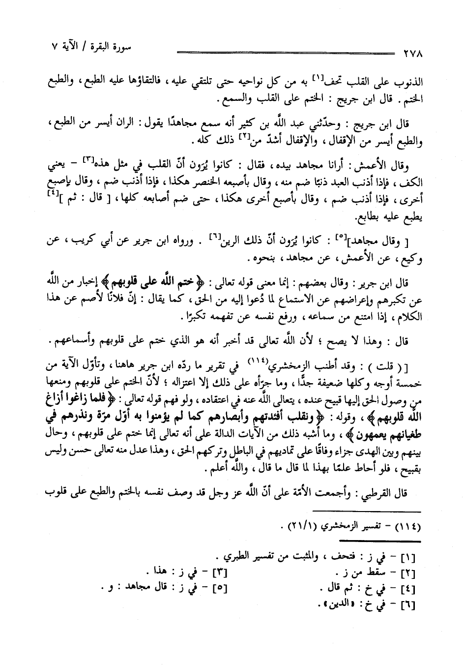 ثُمَّ قَالَ : يُطْبَع عَلَيْهِ بِطَابَعٍ وَقَالَ مُجَاهِد كَانُوا يَرَوْنَ أَنَّ ذَلِكَ الرَّيْن وَرَوَاهُ اِبْن جَرِير عَنْ أَبِي كُرَيْب عَنْ وَكِيع عَنْ الْأَعْمَش عَنْ مُجَاهِد بِنَحْوِهِ قَالَ اِبْن جَرِير وَقَالَ بَعْضهمْ إِنَّمَا مَعْنَى قَوْله تَعَالَى" خَتَمَ اللَّه عَلَى قُلُوبهمْ " إِخْبَار مِنْ اللَّه عَنْ تَكَبُّرهمْ وَإِعْرَاضهمْ عَنْ الِاسْتِمَاع لِمَا دُعُوا إِلَيْهِ مِنْ الْحَقّ كَمَا يُقَال إِنَّ فُلَانًا أَصَمّ عَنْ هَذَا الْكَلَام إِذَا اِمْتَنَعَ عَنْ سَمَاعه وَرَفَعَ نَفْسه عَنْ تَفَهُّمه تَكَبُّرًا قَالَ وَهَذَا لَا يَصِحّ لِأَنَّ اللَّه تَعَالَى قَدْ أَخْبَرَ أَنَّهُ هُوَ الَّذِي خَتَمَ عَلَى قُلُوبهمْ وَأَسْمَاعهمْ " قُلْت " وَقَدْ أَطْنَبَ الزَّمَخْشَرِيّ فِي تَقْرِير مَا رَدَّهُ اِبْن جَرِير هَاهُنَا وَتَأَوَّلَ الْآيَة مِنْ خَمْسَة أَوْجُه وَكُلّهَا ضَعِيفَة جِدًّا وَمَا جَرَّأَهُ عَلَى ذَلِكَ إِلَّا اِعْتِزَاله لِأَنَّ الْخَتْم عَلَى قُلُوبهمْ وَمَنْعهَا مِنْ وُصُول الْحَقّ إِلَيْهَا قَبِيح عِنْده يَتَعَالَى اللَّه عَنْهُ فِي اِعْتِقَاده وَلَوْ فَهِمَ قَوْله تَعَالَى " فَلَمَّا زَاغُوا أَزَاغَ اللَّهُ قُلُوبَهُمْ " وَقَوْله " وَنُقَلِّبُ أَفْئِدَتَهُمْ وَأَبْصَارَهُمْ كَمَا لَمْ يُؤْمِنُوا بِهِ أَوَّل مَرَّة وَنَذَرُهُمْ فِي طُغْيَانهمْ يَعْمَهُونَ " وَمَا أَشْبَه ذَلِكَ مِنْ الْآيَات الدَّالَّة عَلَى أَنَّهُ تَعَالَى إِنَّمَا خَتَمَ عَلَى قُلُوبهمْ وَحَالَ بَيْنهمْ وَبَيْن الْهُدَى جَزَاء وِفَاقًا عَلَى تَمَادِيهِمْ فِي الْبَاطِل وَتَرْكهمْ الْحَقّ وَهَذَا عَدْل مِنْهُ تَعَالَى حَسَن وَلَيْسَ بِقَبِيحٍ فَلَوْ أَحَاطَ عَالِمًا بِهَذَا لَمَا قَالَ مَا قَالَ وَاَللَّه أَعْلَم.