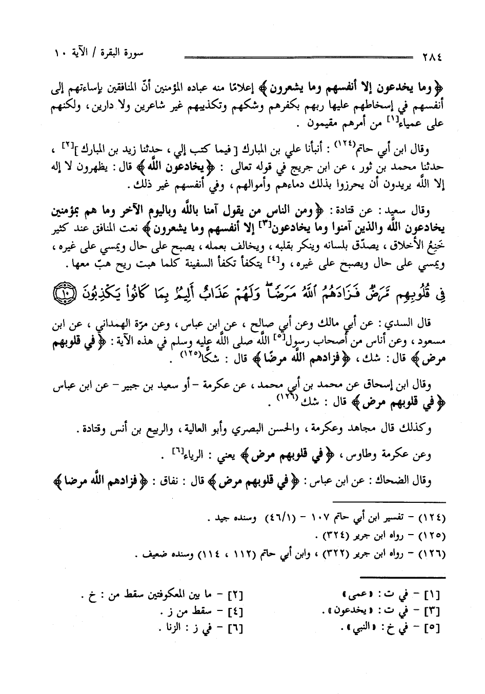 قَالَ السُّدِّيّ عَنْ أَبِي مَالِك وَعَنْ أَبِي صَالِح عَنْ اِبْن عَبَّاس وَعَنْ مُرَّة الْهَمْدَانِيّ عَنْ اِبْن مَسْعُود وَعَنْ أُنَاس مِنْ أَصْحَاب رَسُول اللَّه صَلَّى اللَّه عَلَيْهِ وَسَلَّمَ فِي هَذِهِ الْآيَة " فِي قُلُوبهمْ مَرَض" قَالَ شَكٌّ فَزَادَهُمْ اللَّهُ مَرَضًا قَالَ شَكًّا .