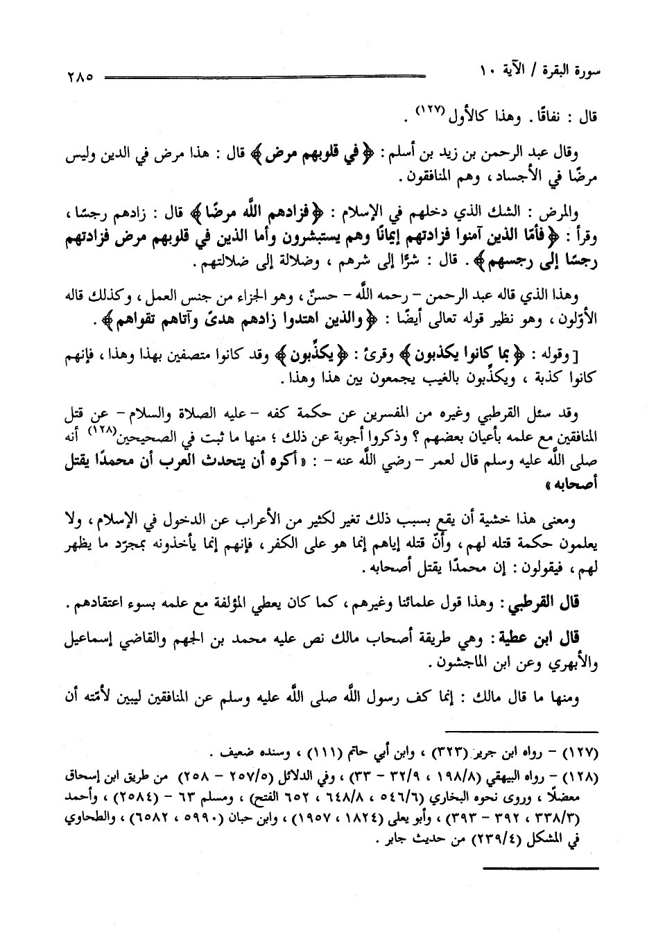 وَقَدْ سُئِلَ الْقُرْطُبِيّ وَغَيْره مِنْ الْمُفَسِّرِينَ عَنْ حِكْمَة كَفّه عَلَيْهِ الصَّلَاة وَالسَّلَام عَنْ قَتْل الْمُنَافِقِينَ مَعَ عِلْمه بِأَعْيَانِ بَعْضهمْ وَذَكَرُوا أَجْوِبَة عَنْ ذَلِكَ مِنْهَا مَا ثَبَتَ فِي الصَّحِيحَيْنِ أَنَّهُ صَلَّى اللَّه عَلَيْهِ وَسَلَّمَ قَالَ لِعُمَر رَضِيَ اللَّه عَنْهُ " أَكْرَهُ أَنْ يَتَحَدَّث الْعَرَب أَنَّ مُحَمَّدًا يَقْتُل أَصْحَابه " وَمَعْنَى هَذَا خَشْيَة أَنْ يَقَع بِسَبَبِ ذَلِكَ تَغَيُّر لِكَثِيرٍ مِنْ الْأَعْرَاب عَنْ الدُّخُول فِي الْإِسْلَام وَلَا يَعْلَمُونَ حِكْمَة قَتْله لَهُمْ وَأَنَّ قَتْله إِيَّاهُمْ إِنَّمَا هُوَ عَلَى الْكُفْر فَإِنَّهُمْ إِنَّمَا يَأْخُذُونَهُ بِمُجَرَّدِ مَا يَظْهَر لَهُمْ فَيَقُولُونَ إِنَّ مُحَمَّدًا يَقْتُل أَصْحَابه .