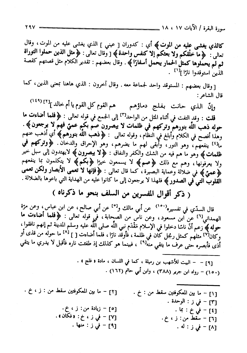" ذِكْرُ أَقْوَالِ الْمُفَسِّرِينَ مِنْ السَّلَف بِنَحْوِ مَا ذَكَرْنَاهُ " قَالَ السُّدِّيّ فِي تَفْسِيره عَنْ أَبِي مَالِك عَنْ أَبِي صَالِح عَنْ اِبْن عَبَّاس وَعَنْ مُرَّة الْهَمْدَانِيّ عَنْ اِبْن مَسْعُود وَعَنْ نَاس مِنْ الصَّحَابَة فِي قَوْله تَعَالَى " فَلَمَّا أَضَاءَتْ مَا حَوْله " زَعَمَ أَنَّ نَاسًا دَخَلُوا فِي الْإِسْلَام مَعَ مَقْدِم نَبِيّ اللَّه صَلَّى اللَّه عَلَيْهِ وَسَلَّمَ الْمَدِينَة ثُمَّ إِنَّهُمْ نَافَقُوا وَكَانَ مَثَلهمْ كَمَثَلِ رَجُل كَانَ فِي ظُلْمَة فَأَوْقَدَ نَارًا فَلَمَّا أَضَاءَتْ مَا حَوْله مِنْ قَذًى أَوْ أَذًى فَأَبْصَرَهُ حَتَّى عَرِفَ مَا يَتَّقِي مِنْهُ فَبَيْنَمَا هُوَ كَذَلِكَ إِذْ طُفِئَتْ نَاره فَأَقْبَلَ لَا يَدْرِي مَا يَتَّقِي