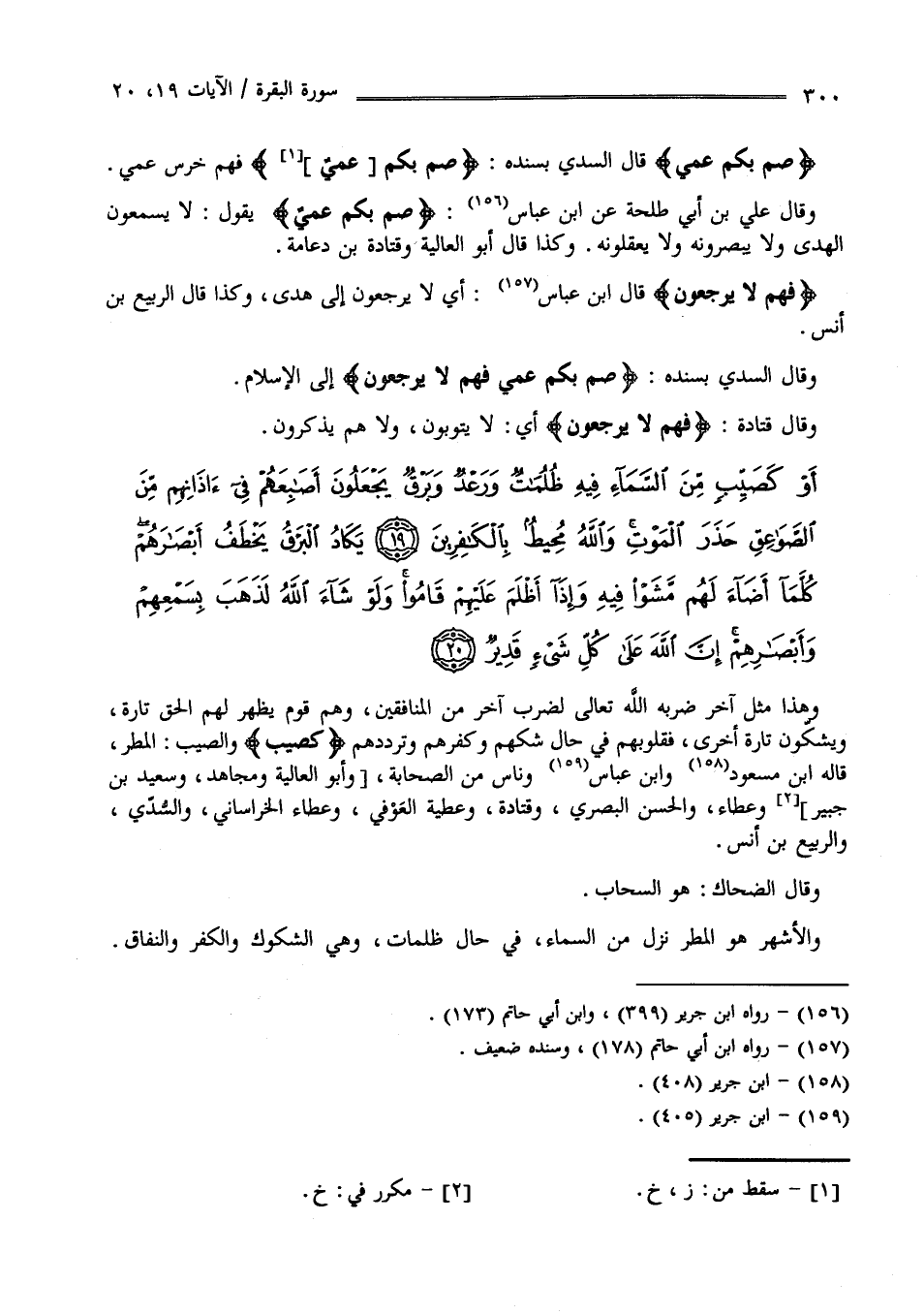 صُمٌّ بُكْمٌ عُمْيٌ " قَالَ السُّدِّيّ بِسَنَدِهِ صُمٌّ بُكْمٌ عُمْيٌ فَهُمْ خُرْسٌ عُمْي وَقَالَ عَلِيّ بْن أَبِي طَلْحَة عَنْ اِبْن عَبَّاس " صُمٌّ بُكْمٌ عُمْي " يَقُول لَا يَسْمَعُونَ