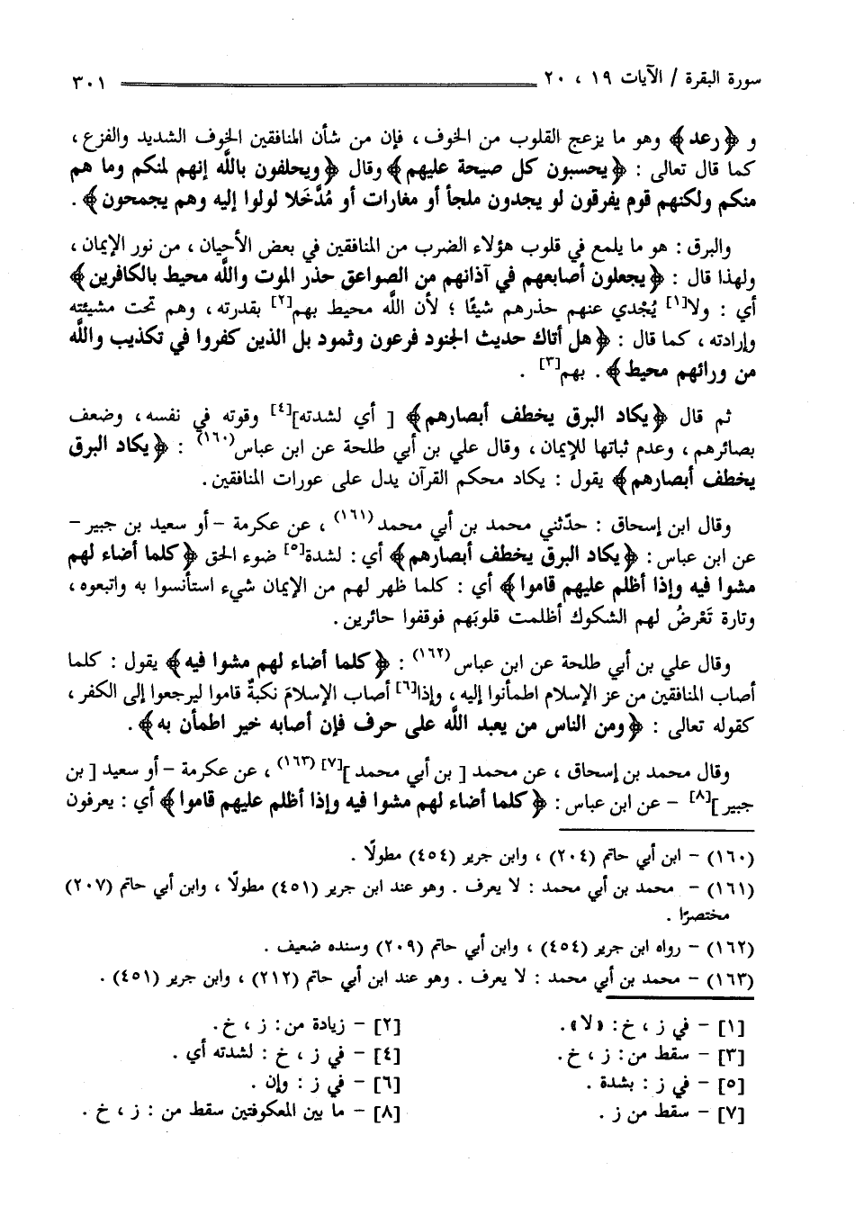 ثُمَّ قَالَ " يَكَاد الْبَرْق يَخْطَف أَبْصَارهمْ " أَيْ لِشِدَّتِهِ وَقُوَّته فِي نَفْسه وَضَعْف بَصَائِرهمْ وَعَدَم ثَبَاتهَا لِلْإِيمَانِ وَقَالَ عَلِيّ بْن أَبِي طَلْحَة عَنْ اِبْن عَبَّاس " يَكَاد الْبَرْق يَخْطَف أَبْصَارهمْ " يَقُول يَكَاد مُحْكَم الْقُرْآن يَدُلّ عَلَى عَوْرَات الْمُنَافِقِينَ وَقَالَ اِبْن إِسْحَاق حَدَّثَنِي مُحَمَّد بْن أَبِي مُحَمَّد عَنْ عِكْرِمَة أَوْ سَعِيد بْن جُبَيْر عَنْ اِبْن عَبَّاس " يَكَاد الْبَرْق يَخْطَف أَبْصَارهمْ " أَيْ لِشِدَّةِ ضَوْء الْحَقّ كُلَّمَا أَضَاءَ لَهُمْ مَشَوْا فِيهِ وَإِذَا أَظْلَمَ عَلَيْهِمْ قَامُوا أَيْ كُلَّمَا ظَهَرَ لَهُمْ مِنْ الْإِيمَان شَيْء اِسْتَأْنَسُوا بِهِ وَاتَّبَعُوهُ وَتَارَة تَعْرِض لَهُمْ الشُّكُوك أَظْلَمَتْ قُلُوبهمْ فَوَقَفُوا حَائِرِينَ وَقَالَ عَلِيّ بْن أَبِي طَلْحَة عَنْ اِبْن عَبَّاس كُلَّمَا أَضَاءَ لَهُمْ مَشَوْا فِيهِ يَقُول كُلَّمَا أَصَابَ الْمُنَافِقِينَ مِنْ عِزّ الْإِسْلَام اِطْمَأَنُّوا إِلَيْهِ وَإِذَا أَصَابَ الْإِسْلَام نَكْبَة قَامُوا لِيَرْجِعُوا إِلَى الْكُفْر كَقَوْلِهِ تَعَالَى " وَمِنْ النَّاس مَنْ يَعْبُدُ اللَّهَ عَلَى حَرْفٍ فَإِنْ أَصَابَهُ خَيْرٌ اِطْمَأَنَّ بِهِ " وَقَالَ مُحَمَّد بْن إِسْحَاق عَنْ مُحَمَّد بْن أَبِي مُحَمَّد عَنْ عِكْرِمَة أَوْ سَعِيد بْن جُبَيْر عَنْ اِبْن عَبَّاس " كُلَّمَا أَضَاءَ لَهُمْ مَشَوْا فِيهِ وَإِذَا أَظْلَمَ عَلَيْهِمْ قَامُوا " أَيْ يَعْرِفُونَ