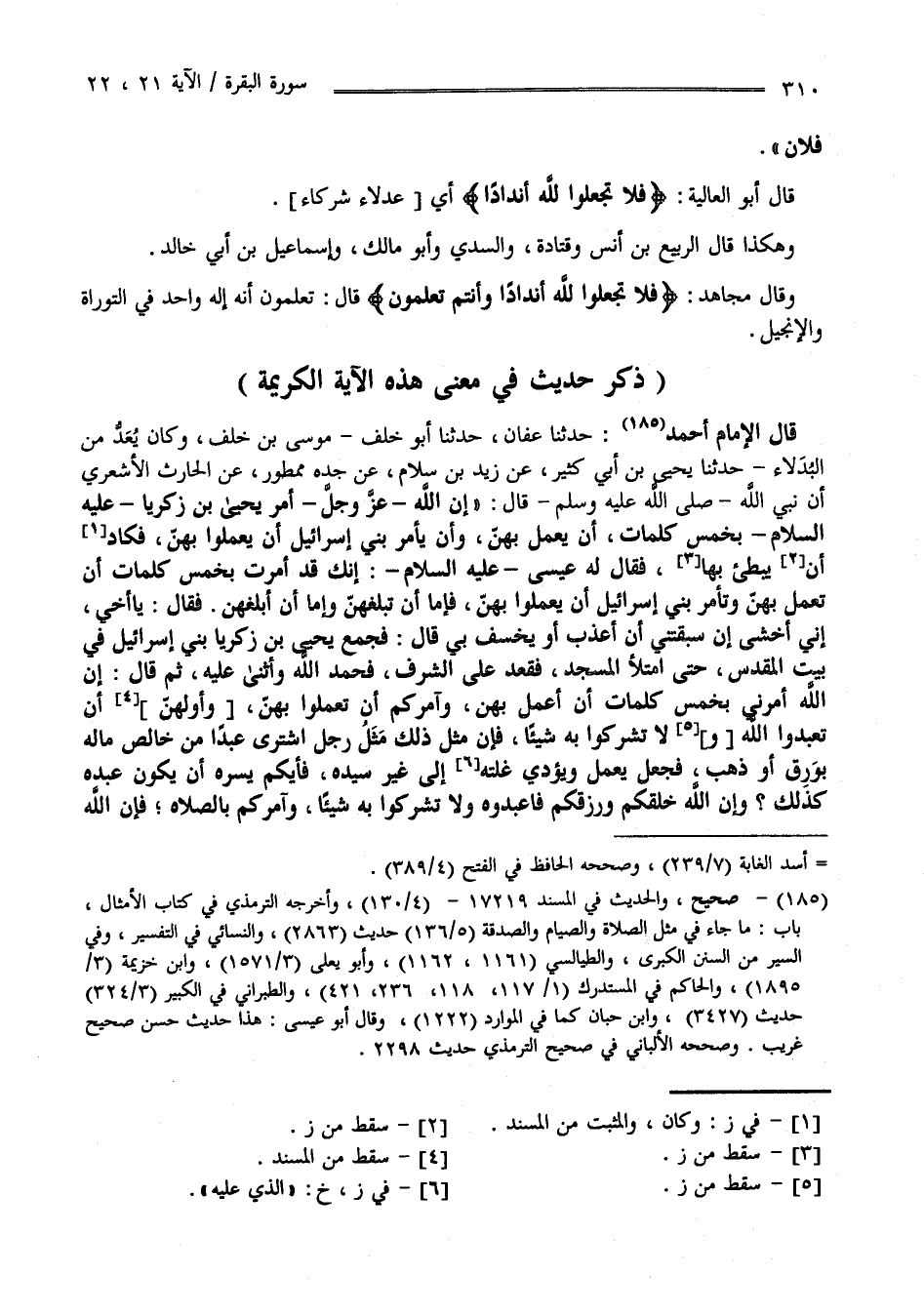 " ذِكْرُ حَدِيث فِي مَعْنَى هَذِهِ الْآيَة الْكَرِيمَة " قَالَ الْإِمَام أَحْمَد حَدَّثَنَا عَفَّان حَدَّثَنَا أَبُو خَلَف مُوسَى بْن خَلَف وَكَانَ يُعَدّ مِنْ الْبُدَلَاء حَدَّثَنَا يَحْيَى بْن أَبِي كَثِير عَنْ زَيْد بْن سَلَّام عَنْ جَدّه مَمْطُور عَنْ الْحَارِث الْأَشْعَرِيّ أَنَّ نَبِيّ اللَّه صَلَّى اللَّه عَلَيْهِ وَسَلَّمَ قَالَ " إِنَّ اللَّه عَزَّ وَجَلَّ أَمَرَ يَحْيَى بْن زَكَرِيَّا عَلَيْهِ السَّلَام بِخَمْسِ كَلِمَات أَنْ يَعْمَل بِهِنَّ وَأَنْ يَأْمُر بَنِي إِسْرَائِيل أَنْ يَعْمَلُوا بِهِنَّ وَأَنَّهُ كَادَ أَنْ يُبْطِئ بِهَا فَقَالَ لَهُ عِيسَى عَلَيْهِ السَّلَام : إِنَّك قَدْ أُمِرْت بِخَمْسِ كَلِمَات أَنْ تَعْمَل بِهِنَّ وَتَأْمُر بَنِي إِسْرَائِيل أَنْ يَعْمَلُوا بِهِنَّ فَإِمَّا أَنْ تُبَلِّغهُنَّ وَإِمَّا أَنْ أُبَلِّغهُنَّ فَقَالَ : يَا أَخِي إِنِّي أَخْشَى إِنْ سَبَقْتنِي أَنْ أُعَذَّب أَوْ يُخْسَف بِي .
