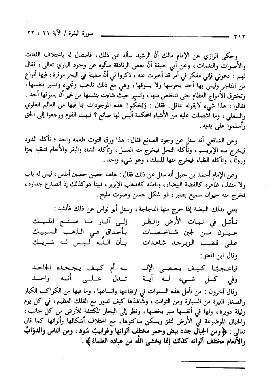 فَبُهِتَ الْقَوْم وَرَجَعُوا إِلَى الْحَقّ وَأَسْلَمُوا عَلَى يَدَيْهِ وَعَنْ الشَّافِعِيّ أَنَّهُ سُئِلَ عَنْ وُجُود الصَّانِع فَقَالَ : هَذَا وَرَق التُّوت طَعْمه وَاحِد تَأْكُلهُ الدُّود فَيَخْرُج مِنْهُ الْإِبْرَيْسَم وَتَأْكُلهُ النَّحْل فَيَخْرُج مِنْهُ الْعَسَل وَتَأْكُلهُ الشَّاة وَالْبَقَر وَالْأَنْعَام فَتُلْقِيه بَعْرًا وَرَوْثًا وَتَأْكُلهُ الظِّبَاء فَيَخْرُج مِنْهَا الْمِسْك وَهُوَ شَيْء وَاحِد وَعَنْ الْإِمَام أَحْمَد بْن حَنْبَل أَنَّهُ سُئِلَ عَنْ ذَلِكَ فَقَالَ : هَاهُنَا حِصْن حَصِين أَمْلَس لَيْسَ لَهُ بَاب وَلَا مَنْفَذ ظَاهِره كَالْفِضَّةِ الْبَيْضَاء وَبَاطِنه كَالذَّهَبِ الْإِبْرِيز فَبَيْنَا هُوَ كَذَلِكَ إِذْ اِنْصَدَعَ جِدَاره فَخَرَجَ مِنْهُ حَيَوَان سَمِيع بَصِير ذُو شَكْل حَسَن وَصَوْت مَلِيح يَعْنِي بِذَلِكَ الْبَيْضَة إِذَا خَرَجَ مِنْهَا الدَّجَاجَة وَسُئِلَ أَبُو نُوَاس عَنْ ذَلِكَ فَأَنْشَدَ :
